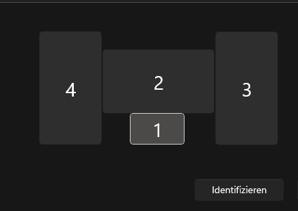 - Drei 4k Monitore, die alle auf 4k Auflösung laufen + 1 Full HD Monitor mit Full HD Auflösung (1920 x 1080) sollen angeschlossen sein. Bei meinem Notebook sind ebenfalls drei 4k Monitore über Thunderbolt 4 Dock angeschlossen und der Full HD Monitor unter dem mittleren 4k Monitor ist der Laptop Screen.