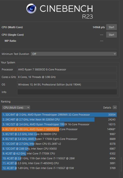 Ich habe eine Installation für Benchmarks, wo alles mögliche an Diensten und sogar der Windows Defender deaktiviert sind....das kann man nicht erwarten, aber ich habe jetzt einem Freund einen Rechner mit X3D gebaut und da hatten wir ohne besondere Anstrengungen 15213 Punkte.