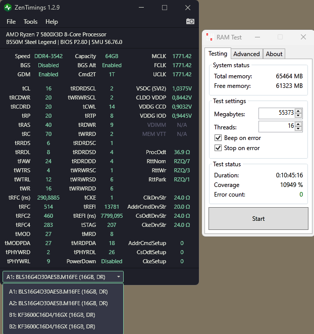 Mit SVM / VBS on, und allen Background Tasks. Find ich schwer OK für 64GB, bei den 16GBit ICs limitiert tRFC und tRCDRD - sind halt keine S8B. (PS: im abgesicherten Modus gehen so ~62,7ns, weniger nicht)