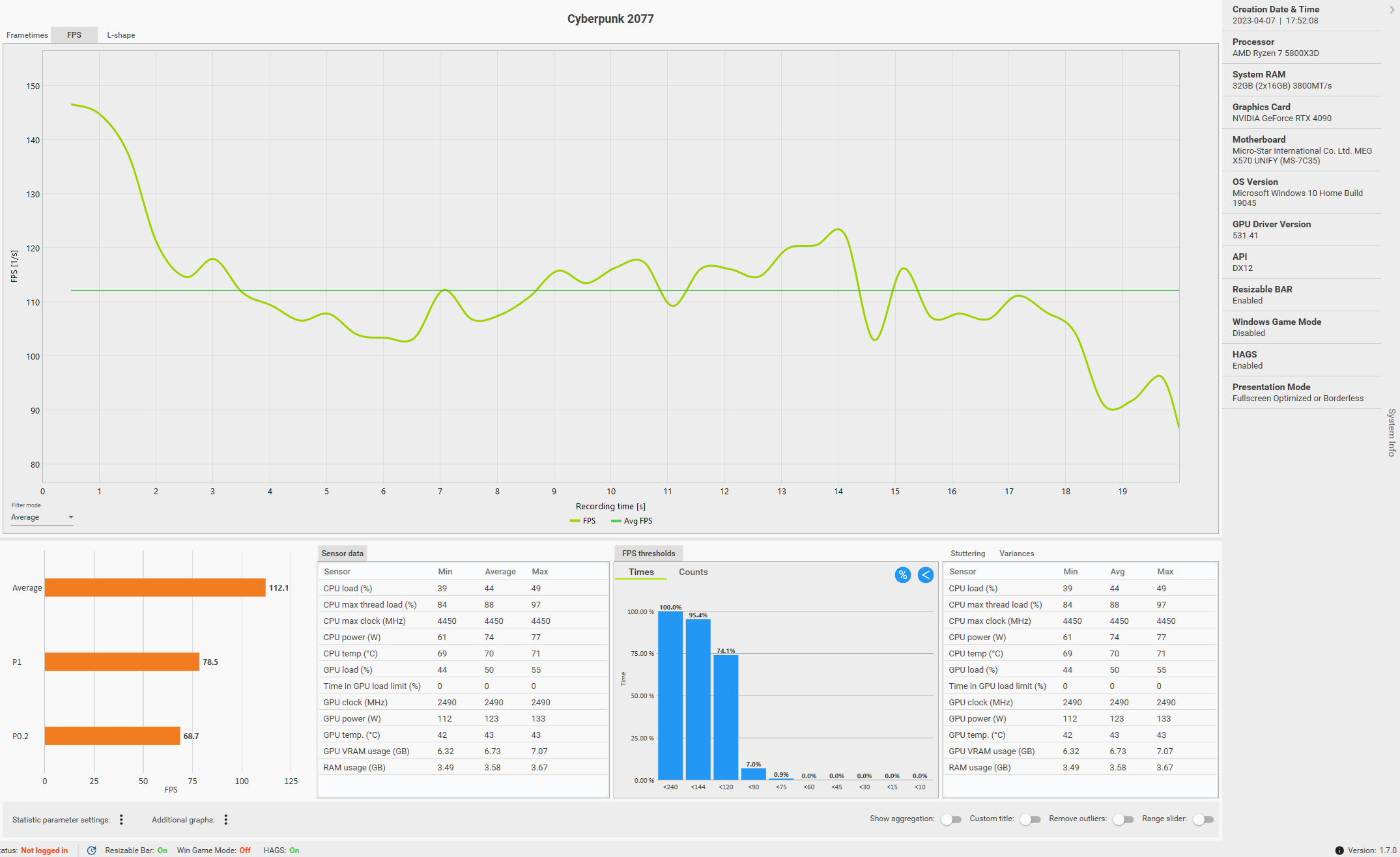 Savegame 24 von PCGH geladen. CapFrameX auf 20 Sekunden eingestellt, gestartet und mit dauervollgas geradeaus gefahren.