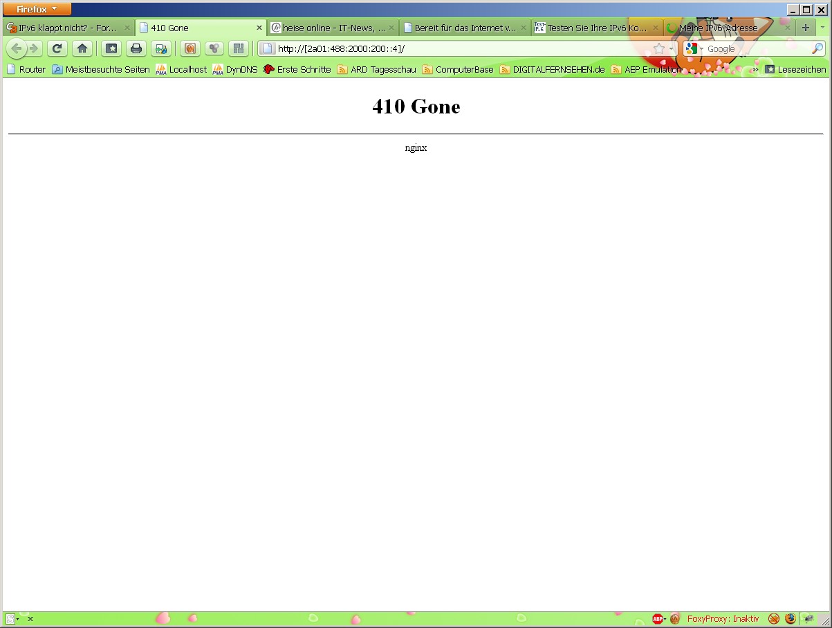 Sorry, hatte ich übersehen. Die Antwort darauf steht schon 1 oder 2 mal weiter oben in einem Beitrag von mir.marcol1979 schrieb:Der 410 Fehler war von gestern mit IPv6, siehe Adresszeile.![]()
