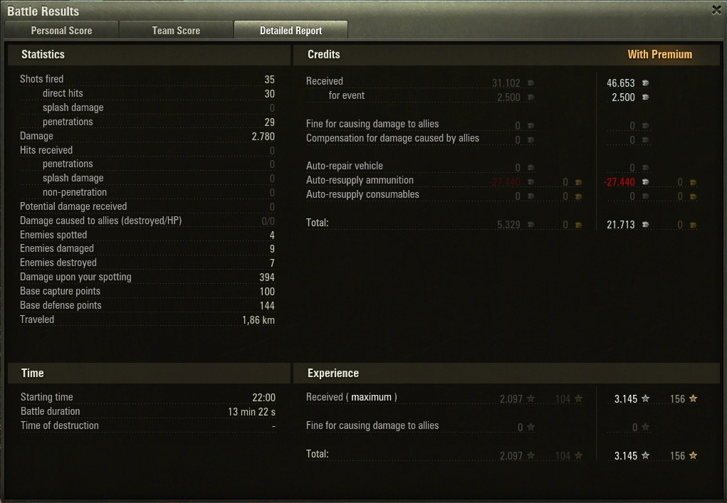 Übrigens im T-29 habe ich nur 10 Goldmumpeln drin und wahr so dreist diese gegen IS-3 einzusetzen. Ist also nach euer Einstellung auch nur ein Protzsieg. Na ja dann protze ich lieber und gewinne 3.000 Gold. Mit dem T-29 bin ich sicherlich unter den TOP 50 was EP angeht.