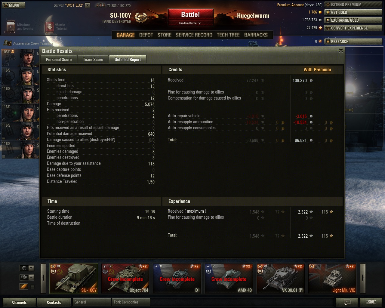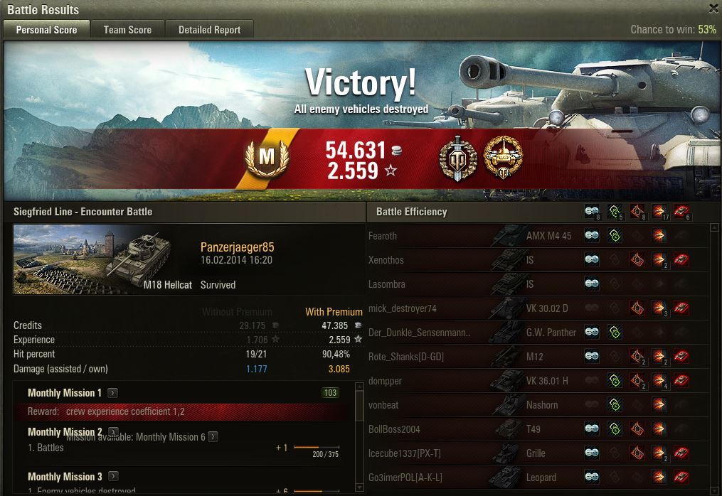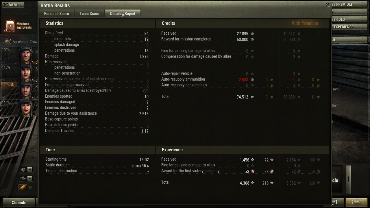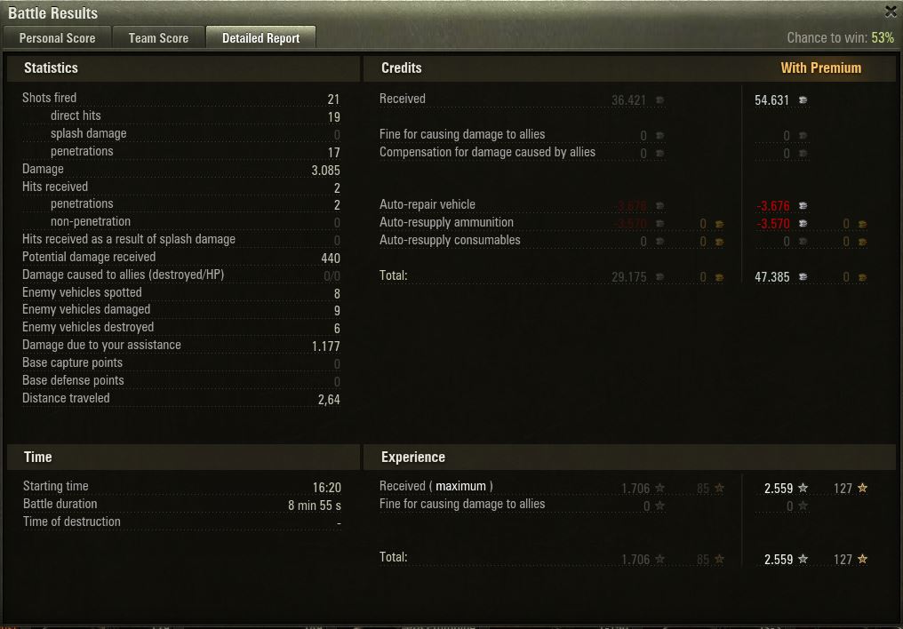 Experience received: 6.696 (x3 for the first victory each day)