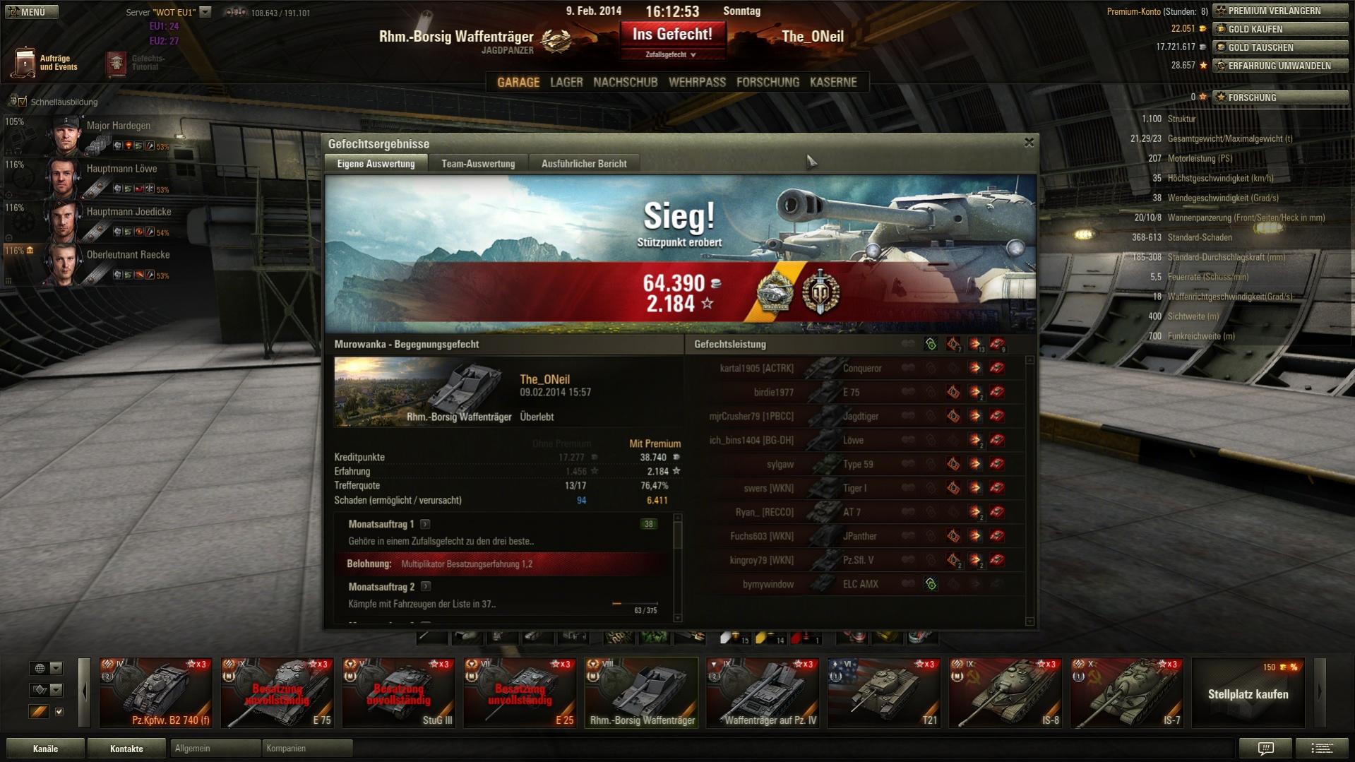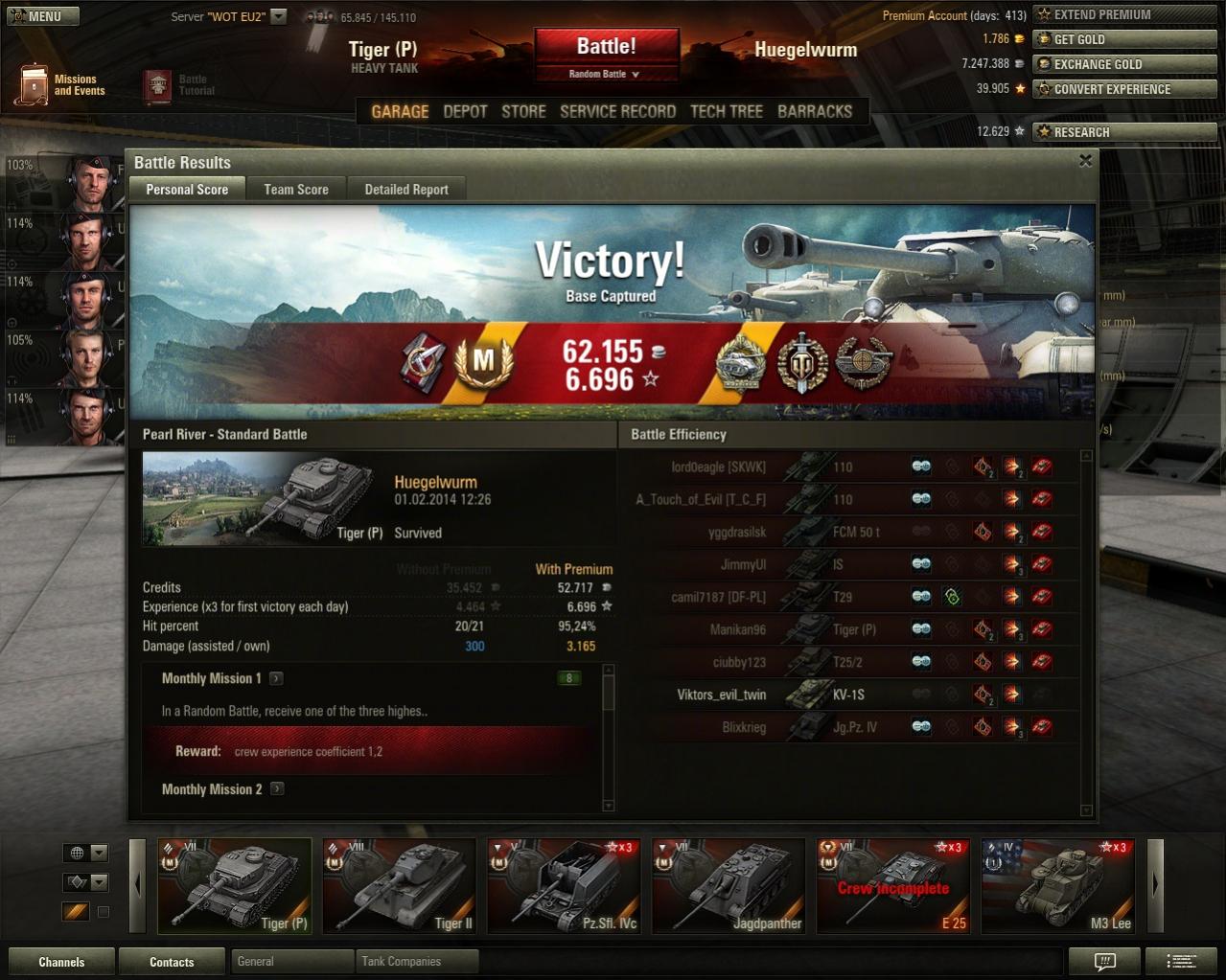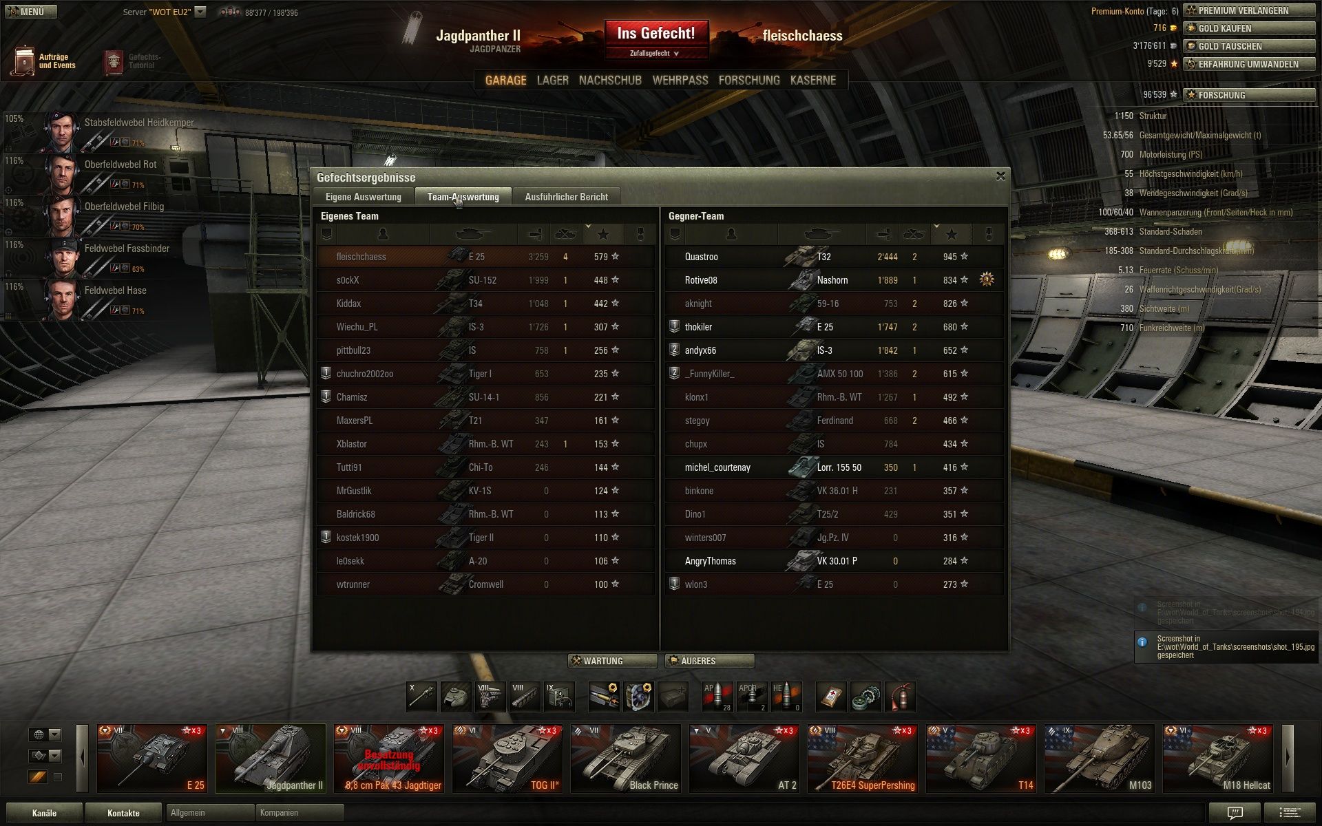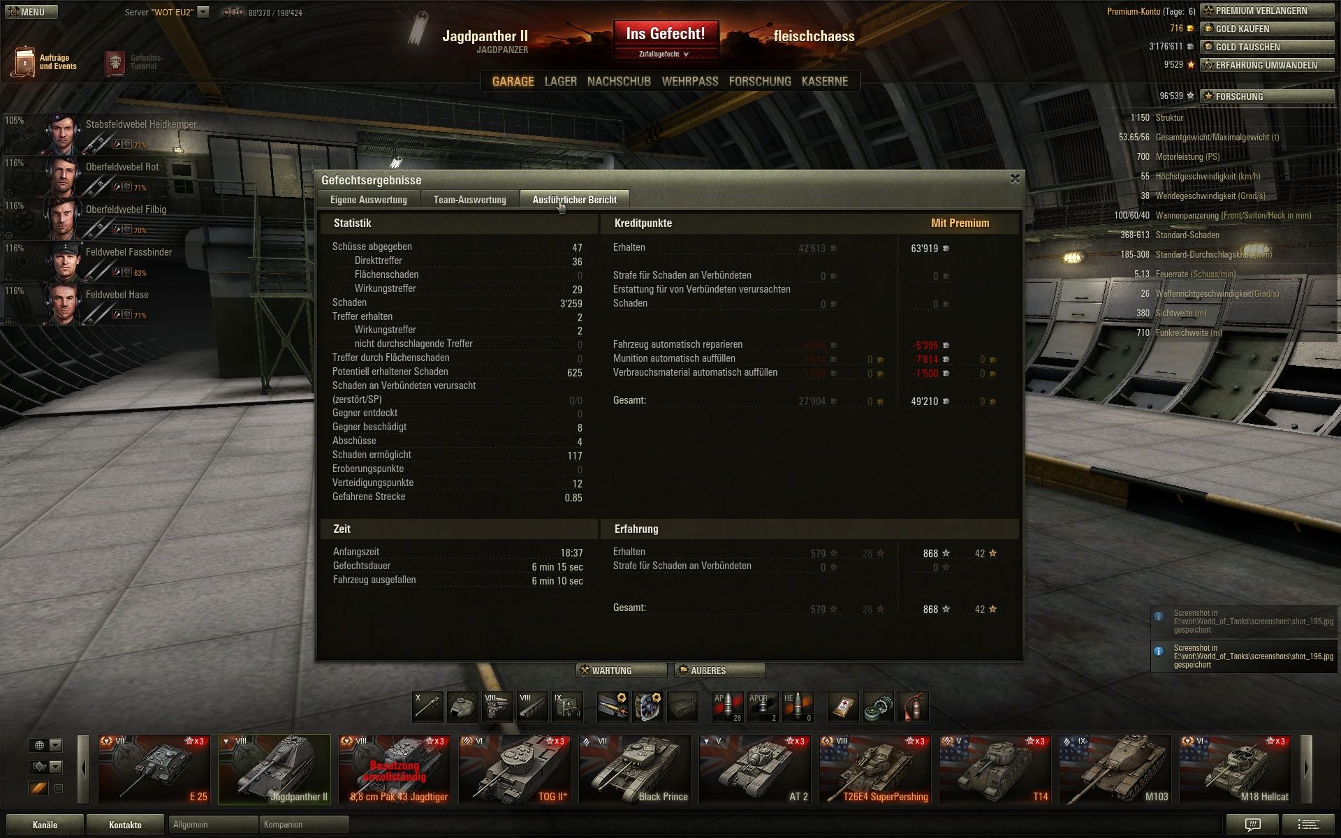 Und das erste mal seit längerem wieder über 2 k XP mit Radley-Walters dazu, da haben sich die 24 Stunden Premium schon gelohnt. Nur schade, dass sich der gegnerische Borsig versteckt hat, eine zweite Pool-Medaille wäre fein gewesen.