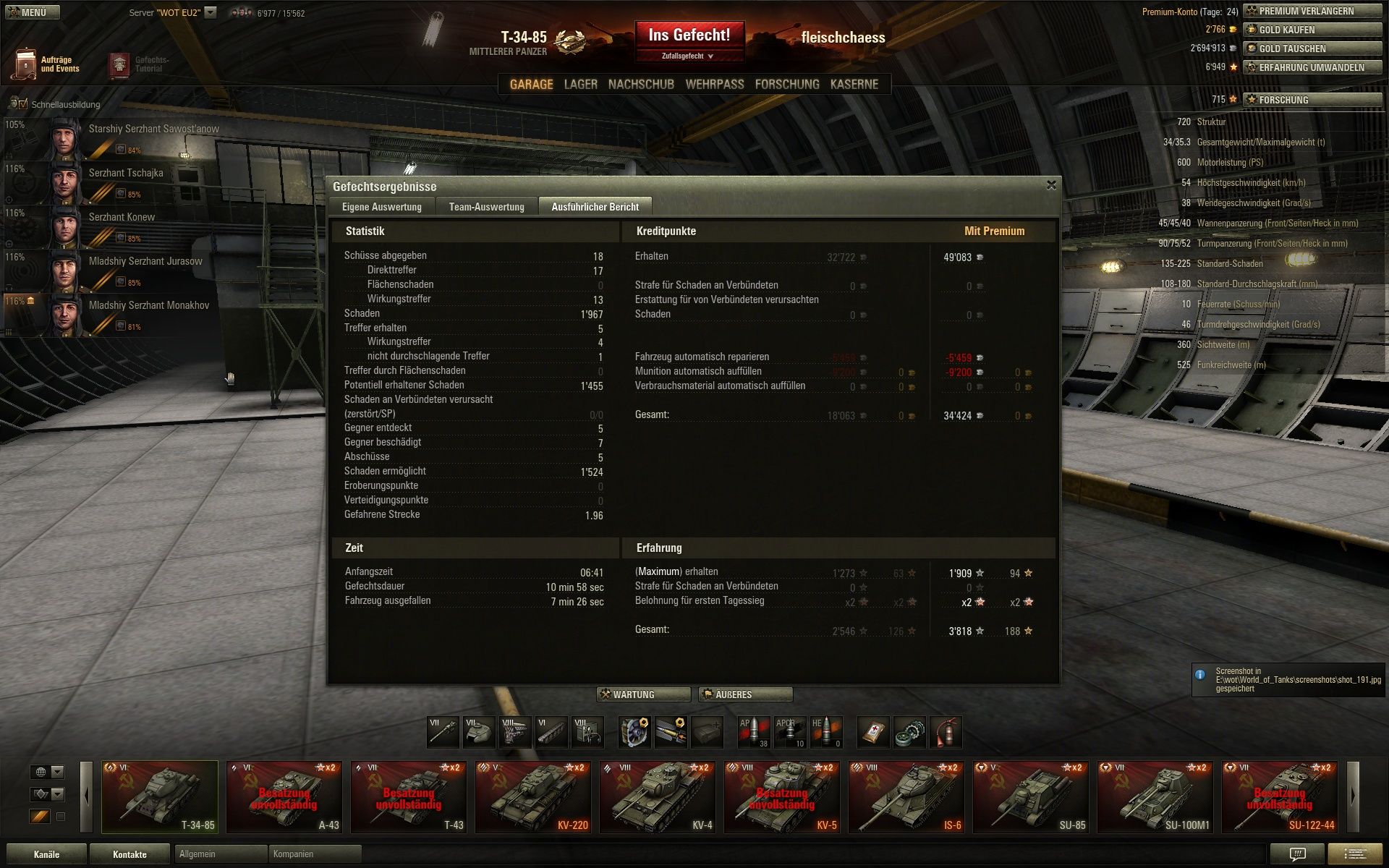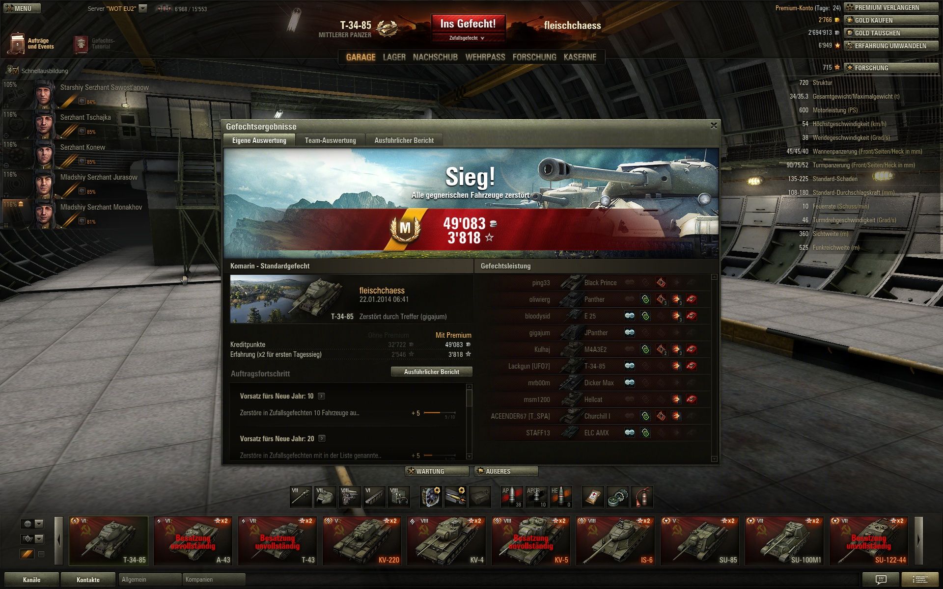 Und noch das Panzerass auf dem T-34-85,Komarin Standard.Hab mich als Scout betätigt,bis mich dann doch noch ein heimtückischer Schuss aus dem nichts platt gemacht hat.
