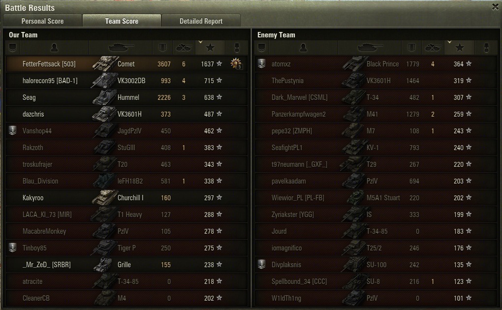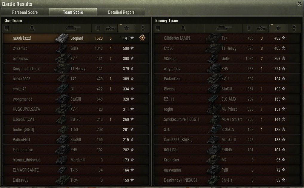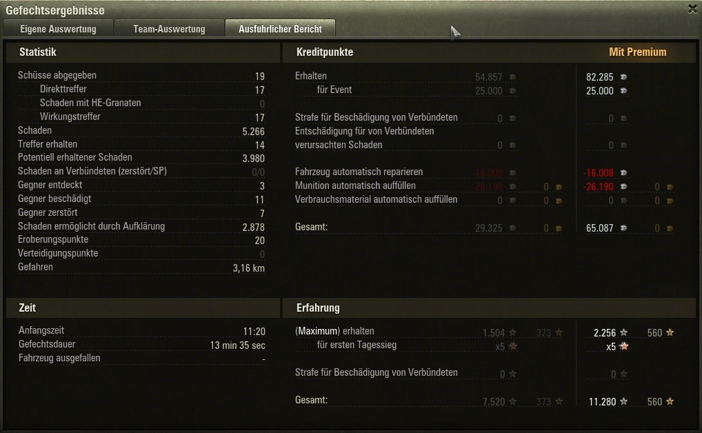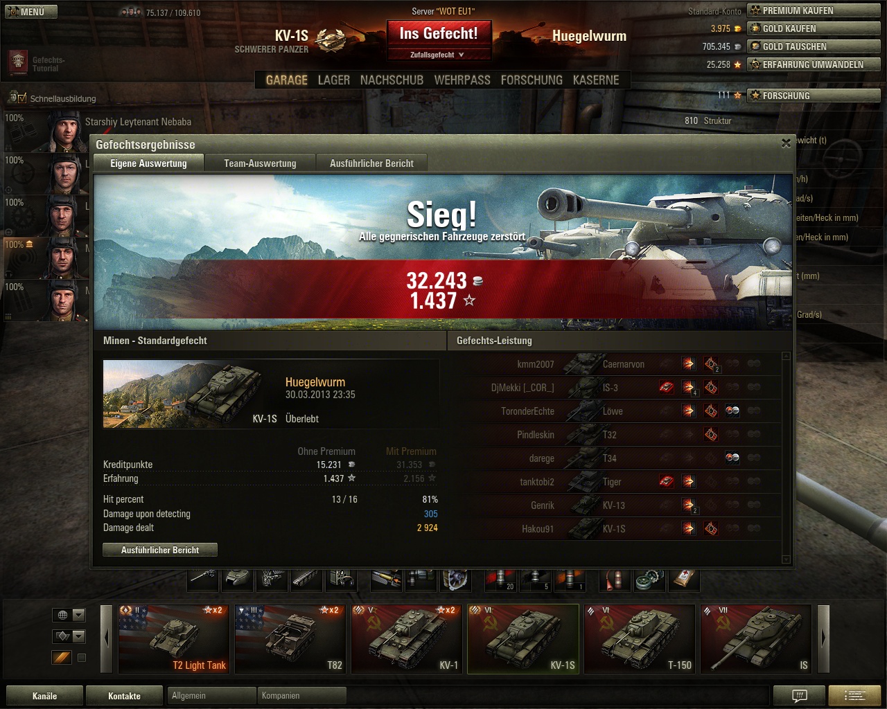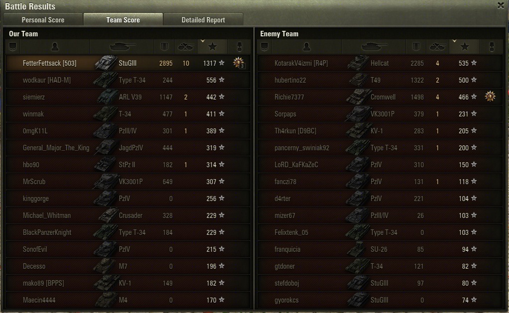 Ich fahr los, suche nach dem Gegner und finde ihn kurz vor der Stadt am Hang - er schießt an mir vorbei, ich treffe, fahre neben ihn und blockiere ihn, bis der ST-1 ankommt, ihm auch noch ne Mumpel reindrückt und die Ketten wegballert (glaub ich). Zurückfahren - Schuss - Aus