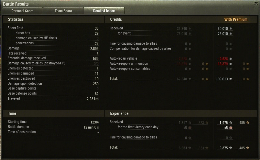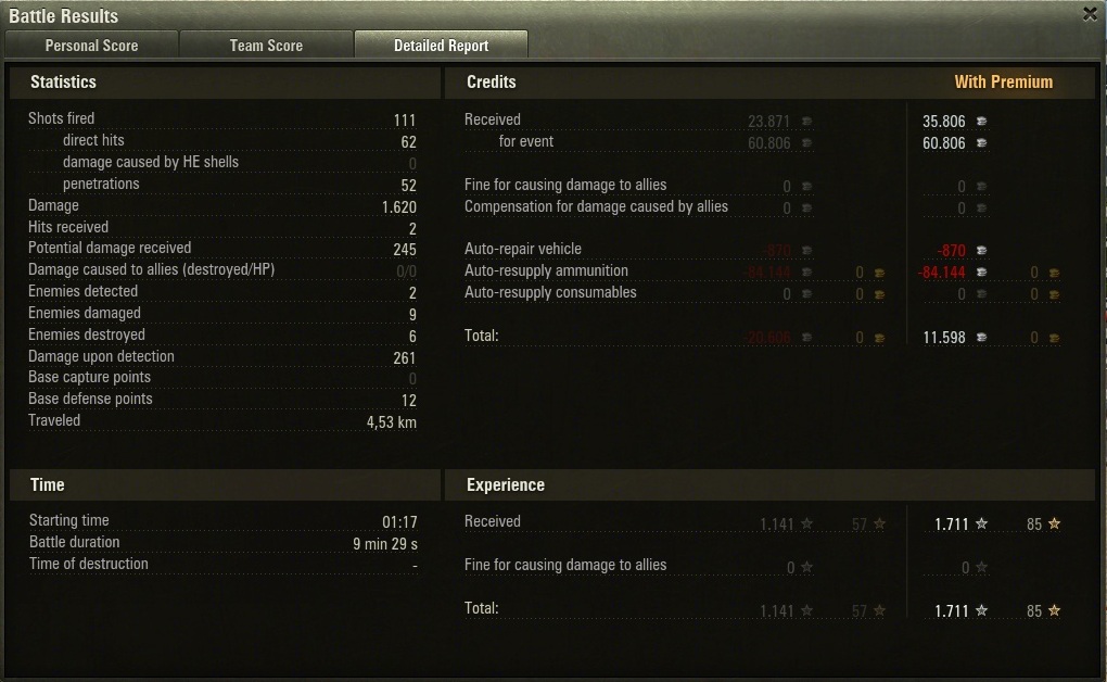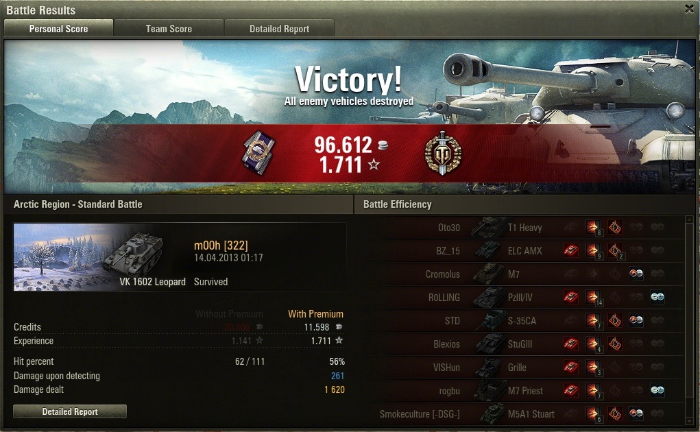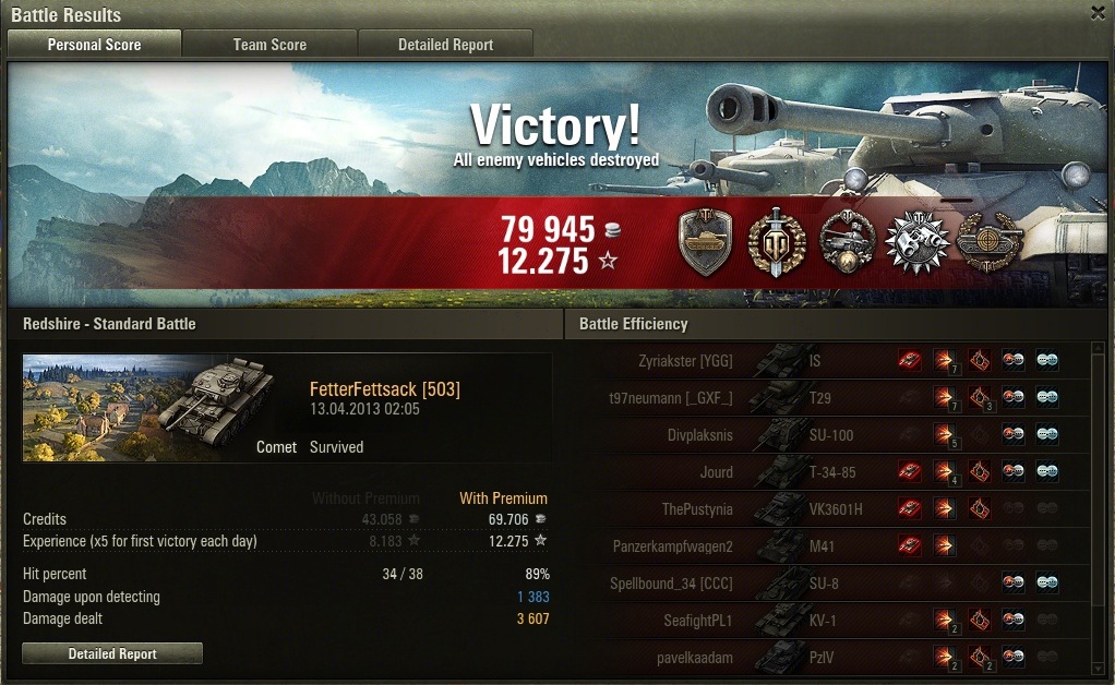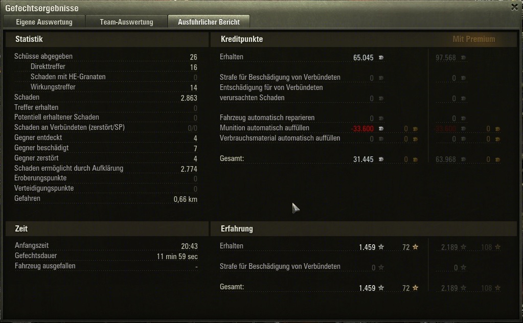 Ich fahr los, suche nach dem Gegner und finde ihn kurz vor der Stadt am Hang - er schießt an mir vorbei, ich treffe, fahre neben ihn und blockiere ihn, bis der ST-1 ankommt, ihm auch noch ne Mumpel reindrückt und die Ketten wegballert (glaub ich). Zurückfahren - Schuss - Aus