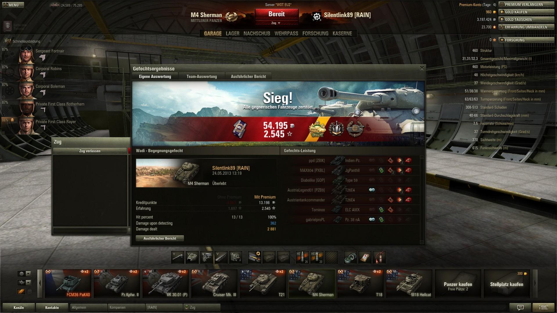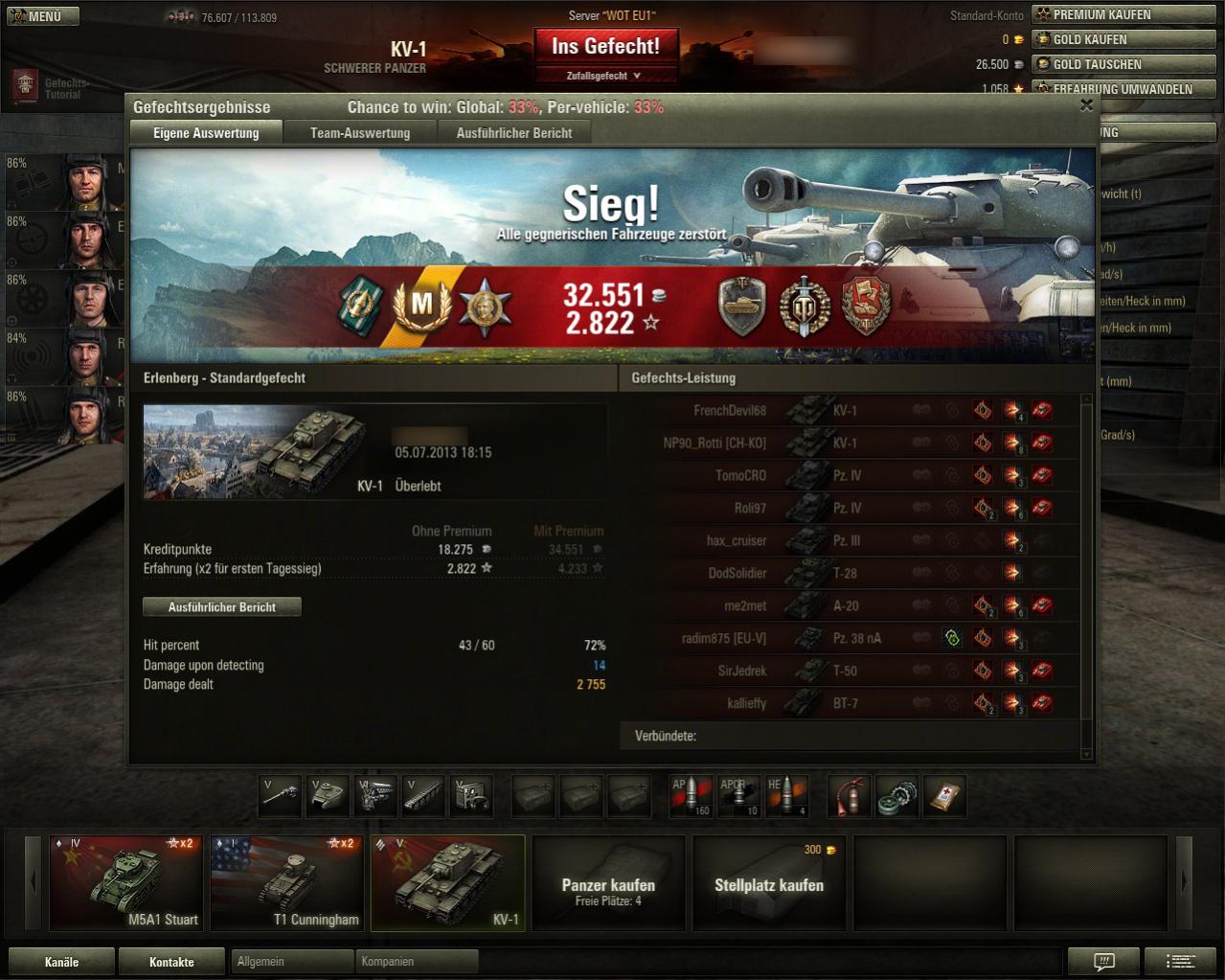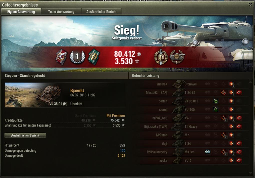 Den E-75 habe ich in Brand gesteckt, darauf hat er gar nicht reagiert, er hat mich einfach vollkommen ignoriert und ist weiter seines Weges gefahren, sodass ich noch einen zweiten Treffer landen konnte. Als er dann nur noch ~15HP hatte und durch den noch andauernden Brand gestorben wäre, hat ein ST-I den kill geklaut (kleine Korrektur deshalb: der ST-I war doch auch noch auf unserer Flanke, den habe ich nur schon wieder vergessen).