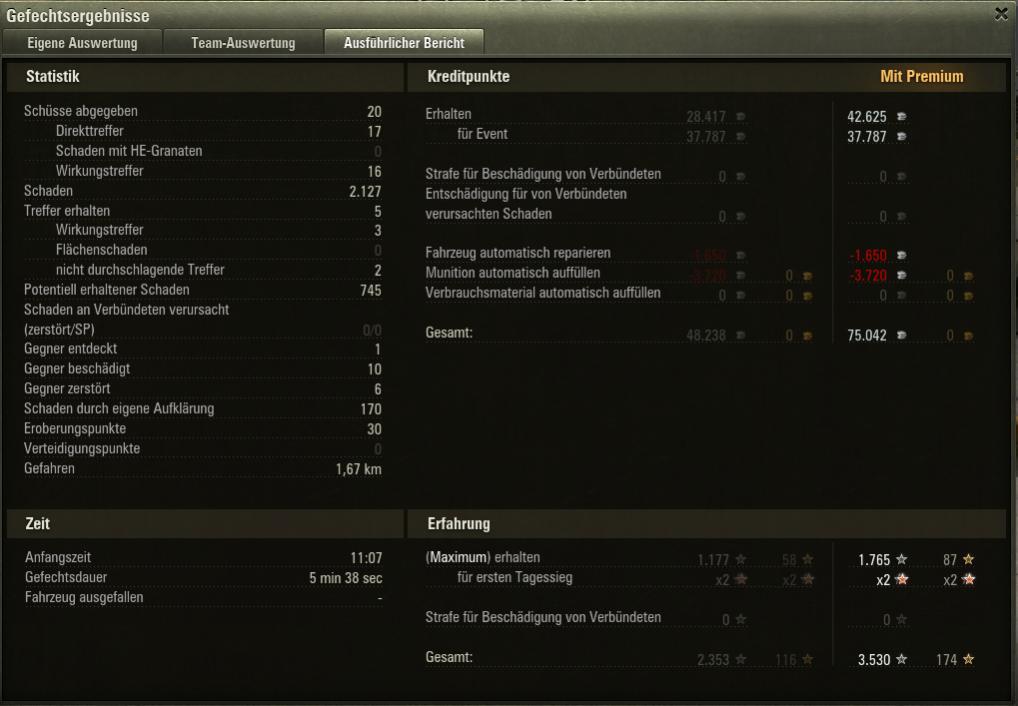 @Spanholz: Es sind genau 5 Goldkugeln durch die Luft geflogen. 4 davon versehentlich. In solchen Gefechten lade ich vor Start eine Goldkugel, um im schlimmsten Fall bessere Chancen zu haben. Nach dem ersten Schuss habe ich aber vergessen, wieder auf normale AP Munition umzuschalten, sodass ich die restlichen 4 auch noch verschossen habe... nötig war das nicht wirklich, alle Schüsse wären auch mit normaler Munition durchgegangen, da ich entweder die Seite oder einen weakspot der Gegner getroffen habe.