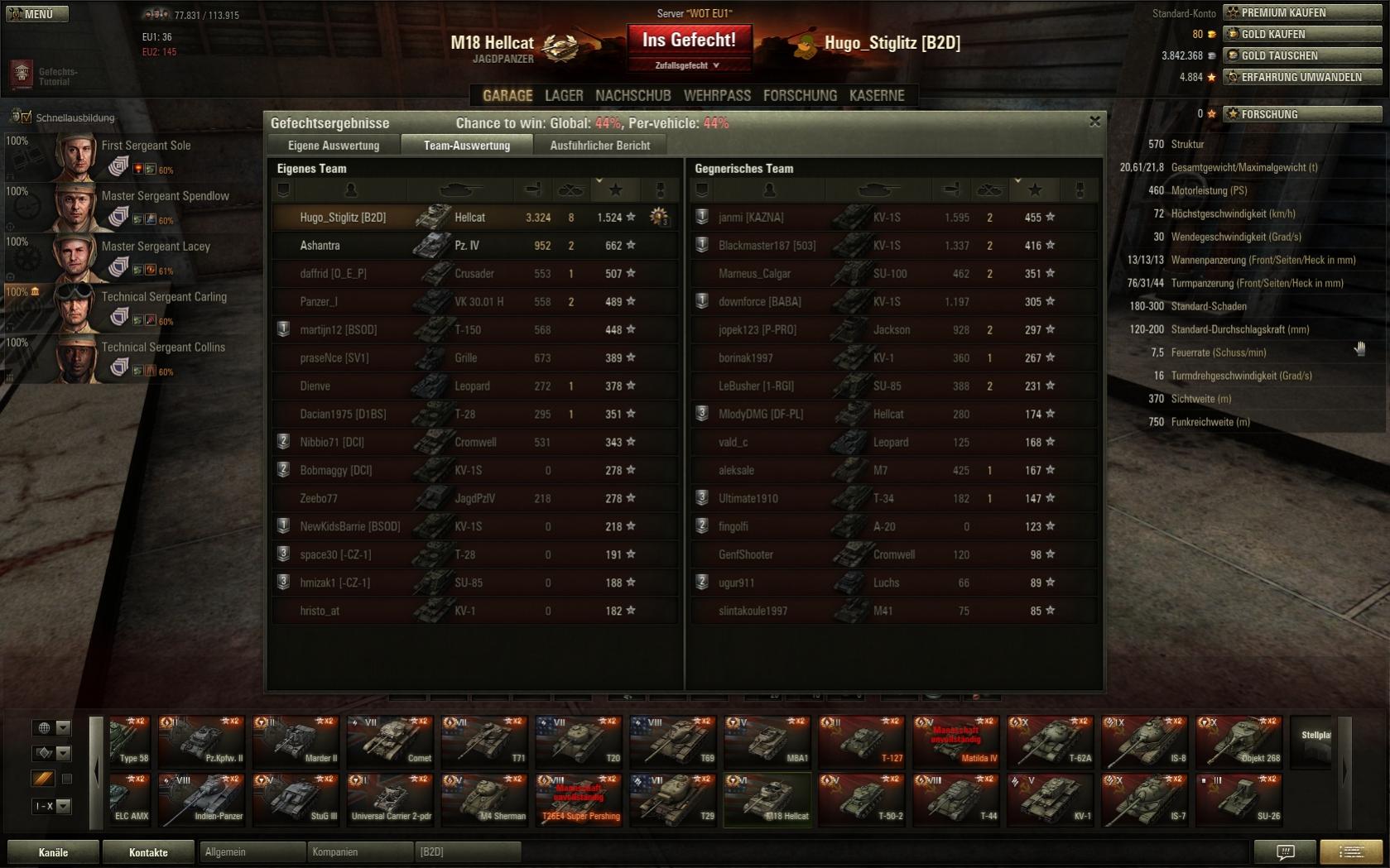 Hellcat...ich liebe meine Hellcat. Aber manchmal wird man halt vom Bären gefressen, viermal habe ich blöd verloren, was ich ja schon fast nicht glauben konnte (Nicht in der Hellcat, in anderen Panzern durchaus). Im fünften Match lässt mich XVM auch nicht gerade gutes erwarten und richtig: Im Gegnerteam ist ein Zug KV-1s, die ihr Handwerk beherrschen -> 81%, 77% und 61% Tank-Winrate. Ach du Scheiße