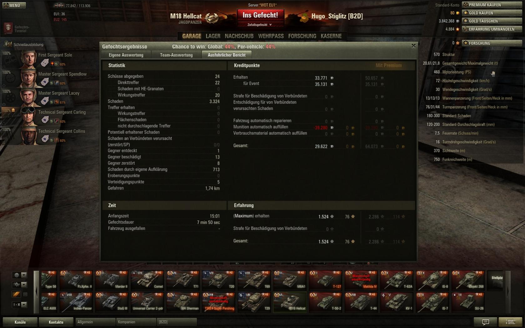 Einer der IS-3 hat versucht, mich und den JT hulldown auf ~200-300m Entfernung zu bekämpfen, während er selbst auf offenem Feld stand. Der Rest hat sich auch irgendwo auf dem Feld bewegt, nur beim T34 und beim Leopard bin ich mir nicht sicher...