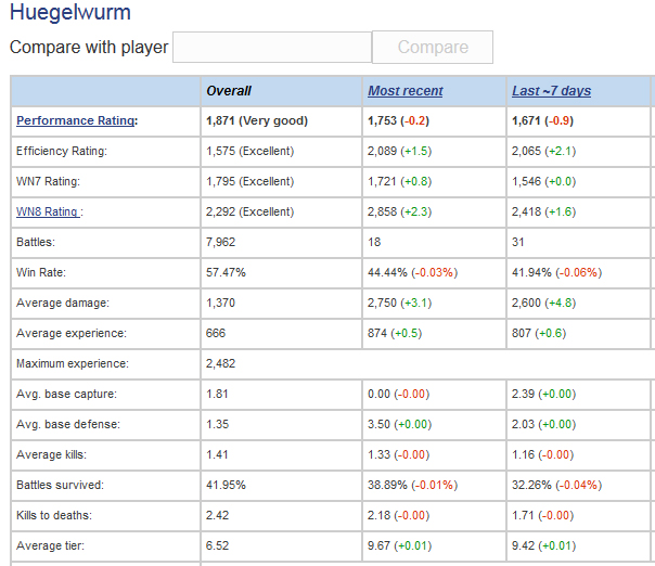 So, nach 1,5 Jahren Pause hab ich WoT auch mal wieder probehalber installiert und ein paar Runden gedreht. Die ersten ~30 Games liefen normal (für meine lange Pause hab' ich mich recht gut geschlagen - werd ja auch nicht jünger) - aber die nächsten 12 wurden wieder allesamt in Rekordzeit verloren. Geht es heute so weiter (hab mir den Premiumtag erspielt) falle ich heute unter 61 % (wenn ich nicht sogar schon drunter bin).