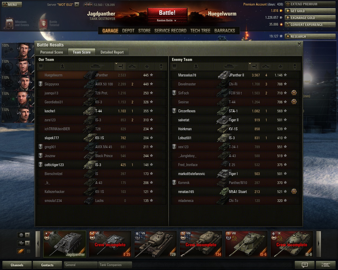 ja, das mit der goldmun war wirklich ein entscheidener fehler, was das balancing angeht. wir hatten ja neulichst die diskusion mit dem T69 und das dieser häufig bis immer mit gold gefahren wird. gehen wir nun davon aus, es gäbe diese goldmun nicht, dann würde wahrscheinlich niemand mehr den T69 fahren und WG müsste eingreifen. jetzt können sie sich hingegen ausruhen.SeroEna schrieb:Solange WG nämlich die Panzer anhand Ihrer Grunddaten balanced, um dann durch die Hintertür Goldmunition einzuführen und völlig deren Auswirkung vernachlässigt, wird das nichts. Dazu kommt, das die Leistung nicht auf Testservern oder im CW gemessen werden kann, sondern nur casual im Random.