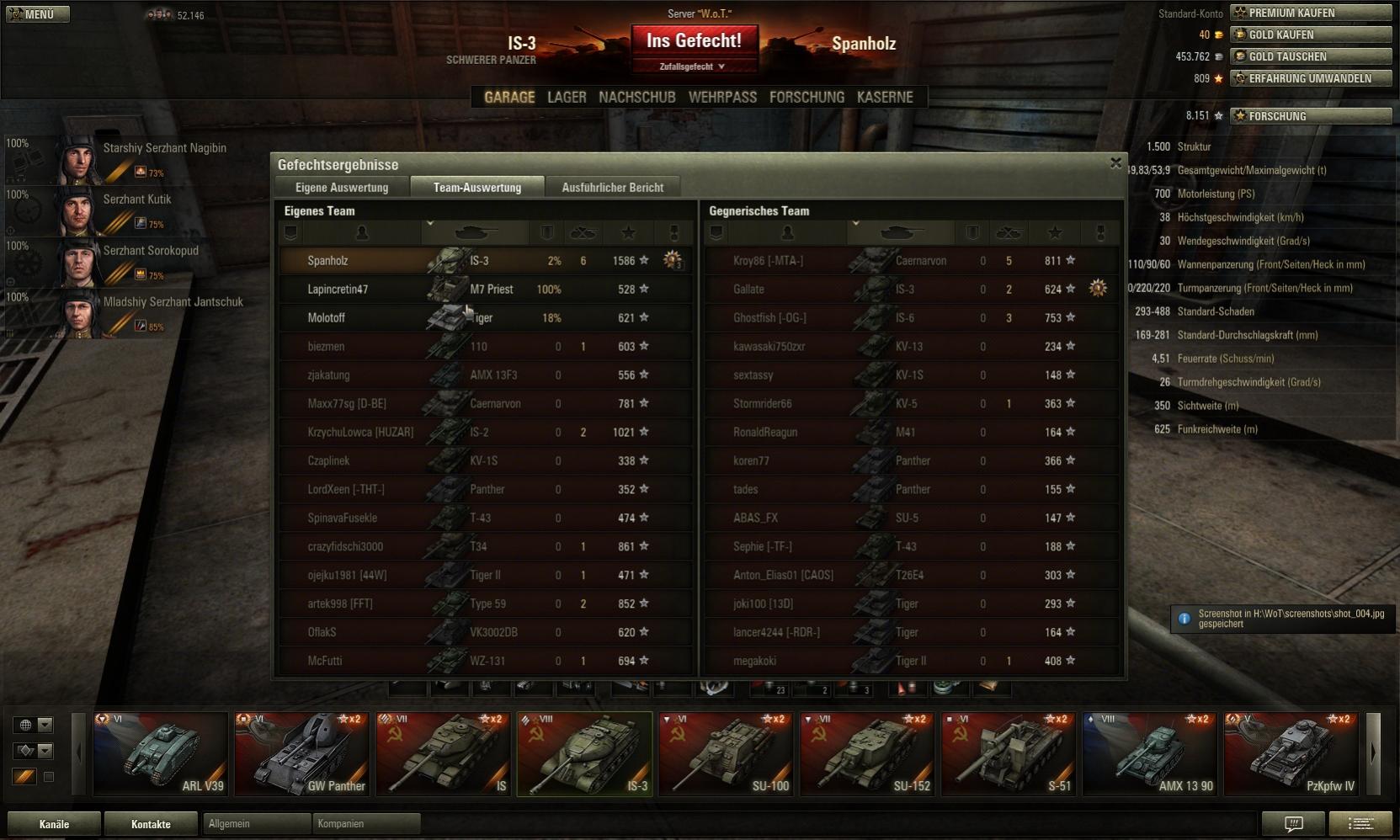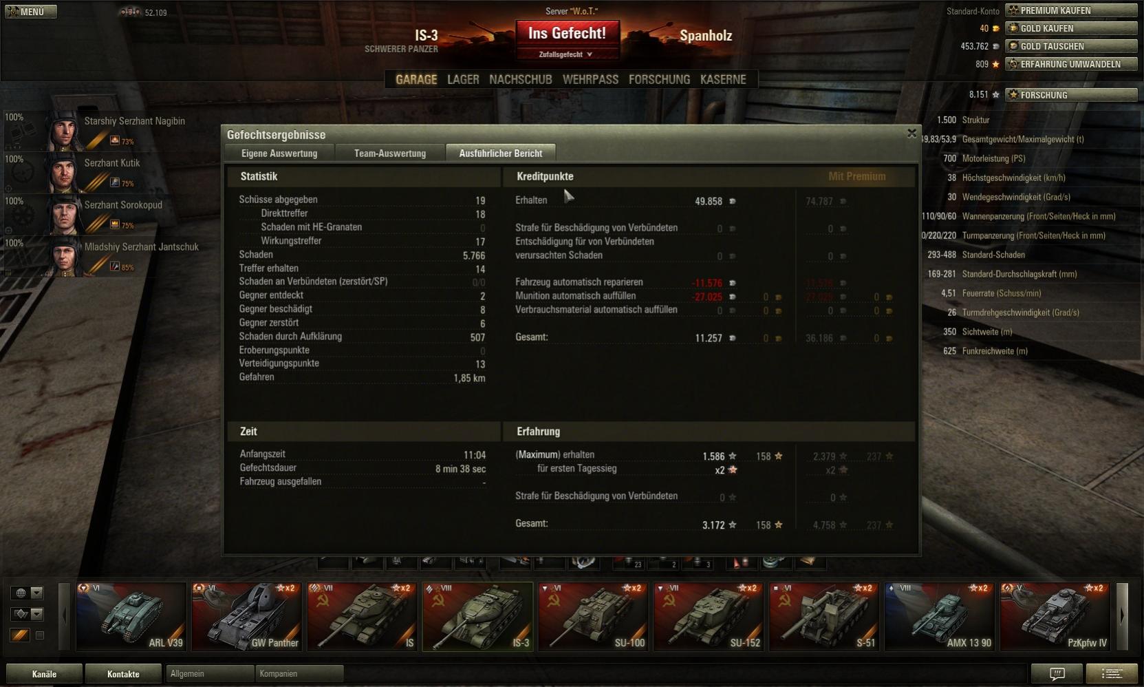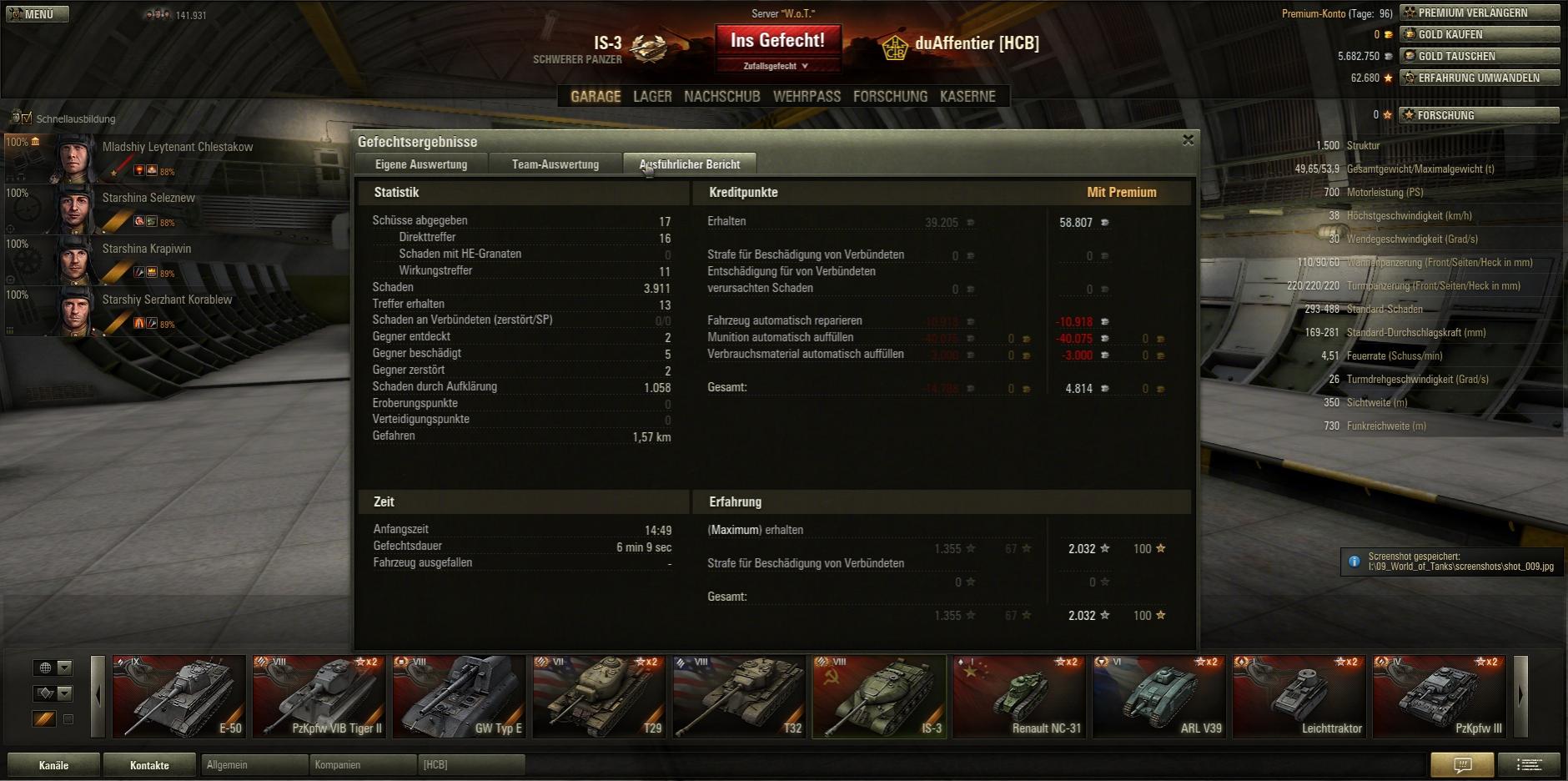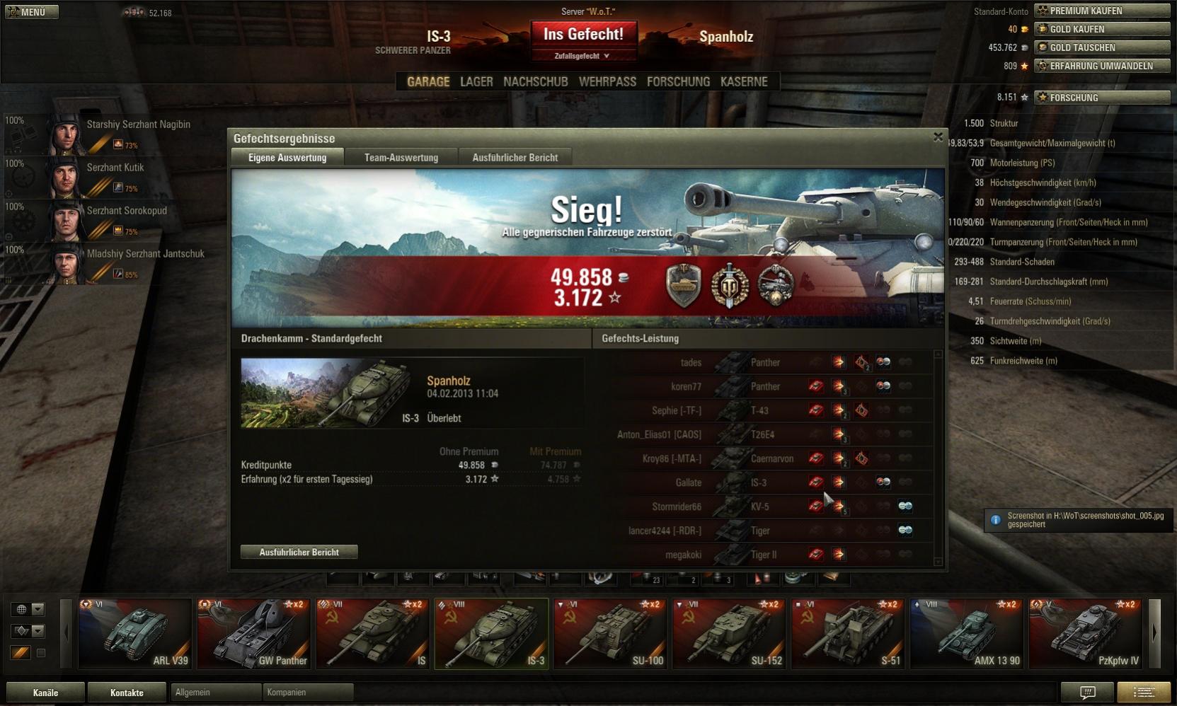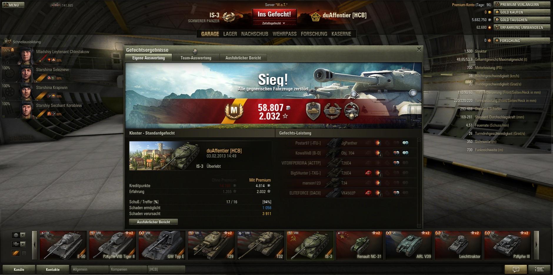 Sieg! Gefecht: Karelien Samstag, 2. Februar 2013 13:21:17 Fahrzeug: T-54 Erfahrung: 2.334 Kreditpunkte: 96.876 Leistungen auf dem Schlachtfeld: Stahlwand, Krieger, Wachposten, Richtschütze, Überlegenheitsabz.: "Panzerass"
