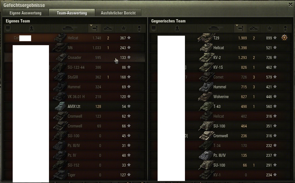 Eben dann ENDLICH mal ein T7 Gefecht ohne Arty und was passiert? Meine Teammates rushen in einer Reihe hintereinander (ohne Witz...) mit 10 Sekunden Abstand einzeln zum Gegner, die da alle schön standen und einem nach den anderen abgeschossen haben. Nach 2 Minuten stand es 11:1 .... meine zwei Kills und knapp 2000 Schaden haben es dann auch nicht mehr rausgerissen...