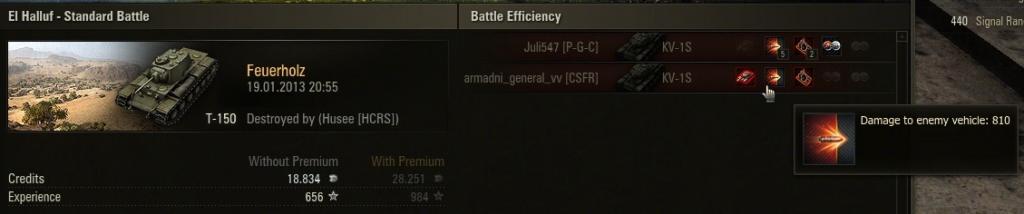 Zum T-150 noch eine Frage: Habe damit gerade einen KV-1S mit EINEM SCHUSS zerlegt. 810 HP Schaden. Wie kommt das denn? Einen derart hohen Schaden habe ich damit noch nie verursacht. Maximal waren bisher so ca. 380 drin.