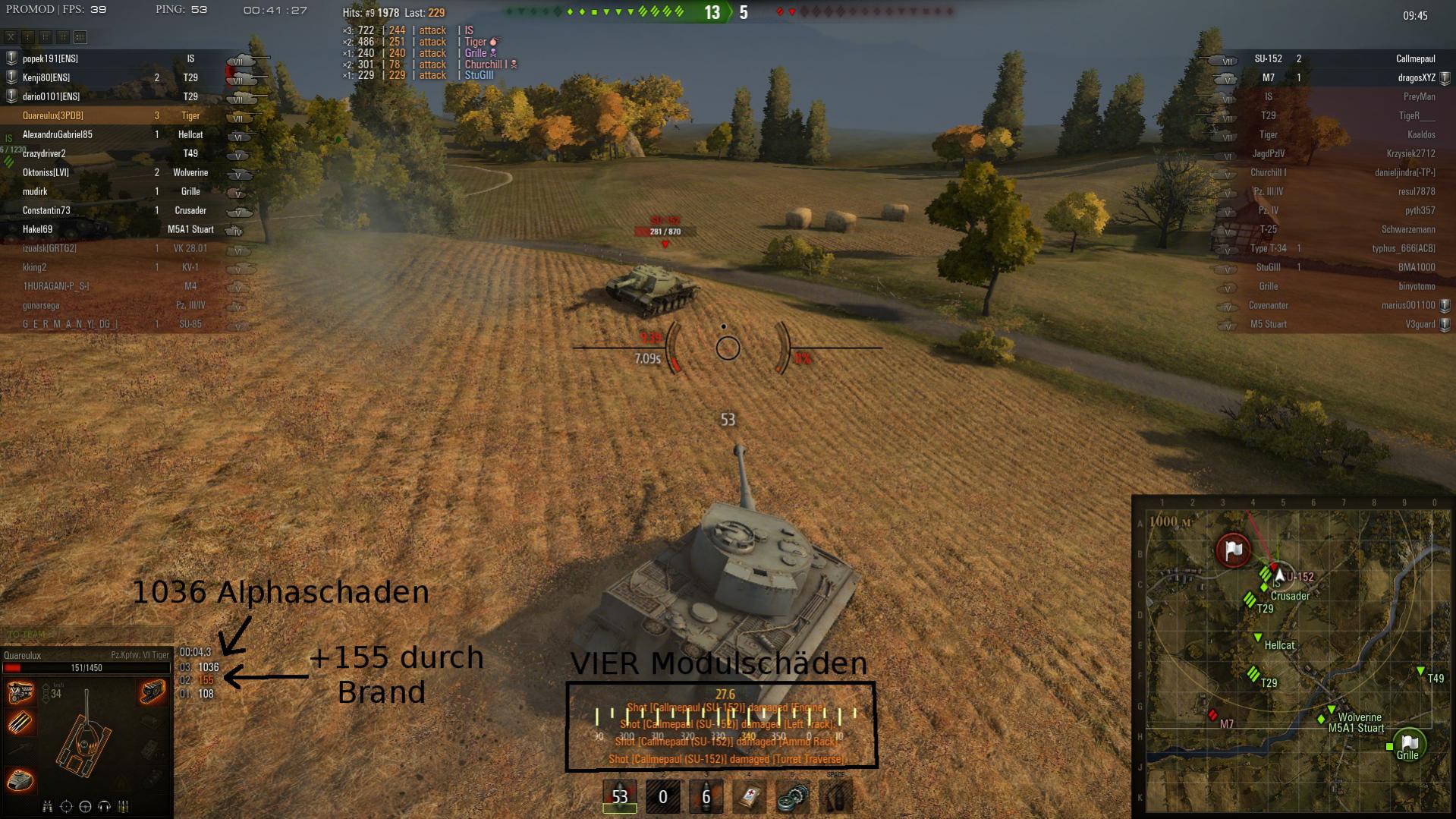 Die ISU-152 hieß nicht umsonst sveroboj (Großwildäger). Es gibt einen Bericht, laut dem eine ISU-152 mit einem Treffer einem Panther einfach den Turm von der Wanne runtergedrückt hat. Nur durch die Wucht des Aufschlages, nicht etwa durch eine Explosion...ChristianB96 schrieb:Aber dass der mir nur durch den einen Treffer mehr als 80% meiner HP abzieht und mir nebenbei noch 4 (davon drei wichtige) Module kaputtmacht (jap, war alles der Schuss, der Brand hat mir nur noch HPs abgezogen) find ich schon etwas überzogen...