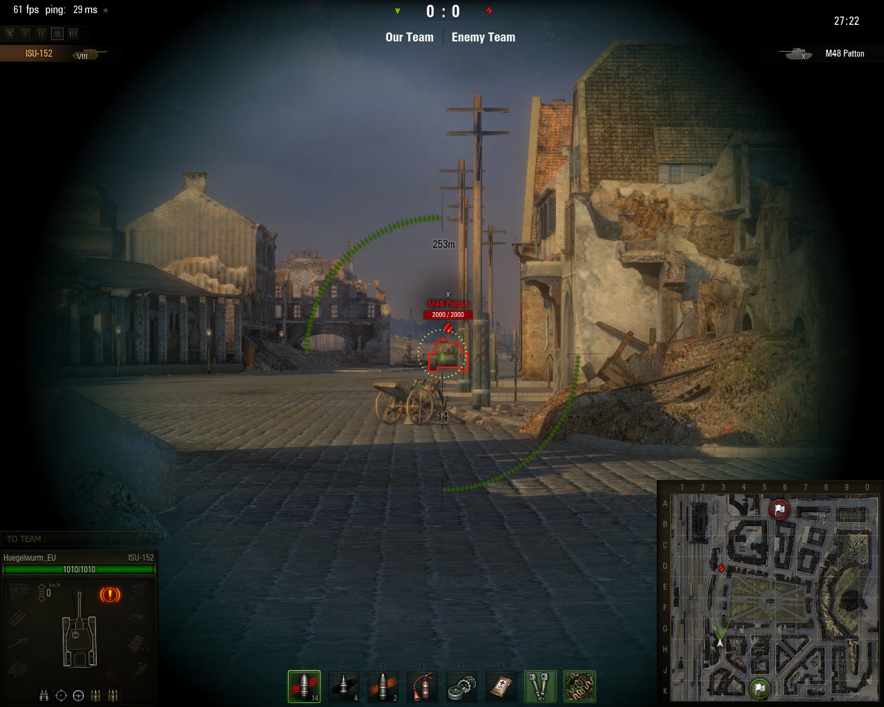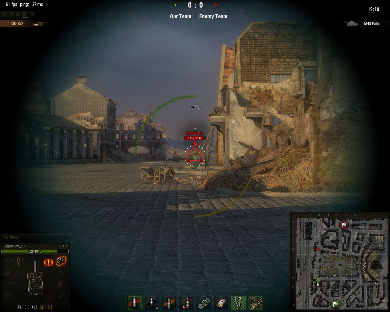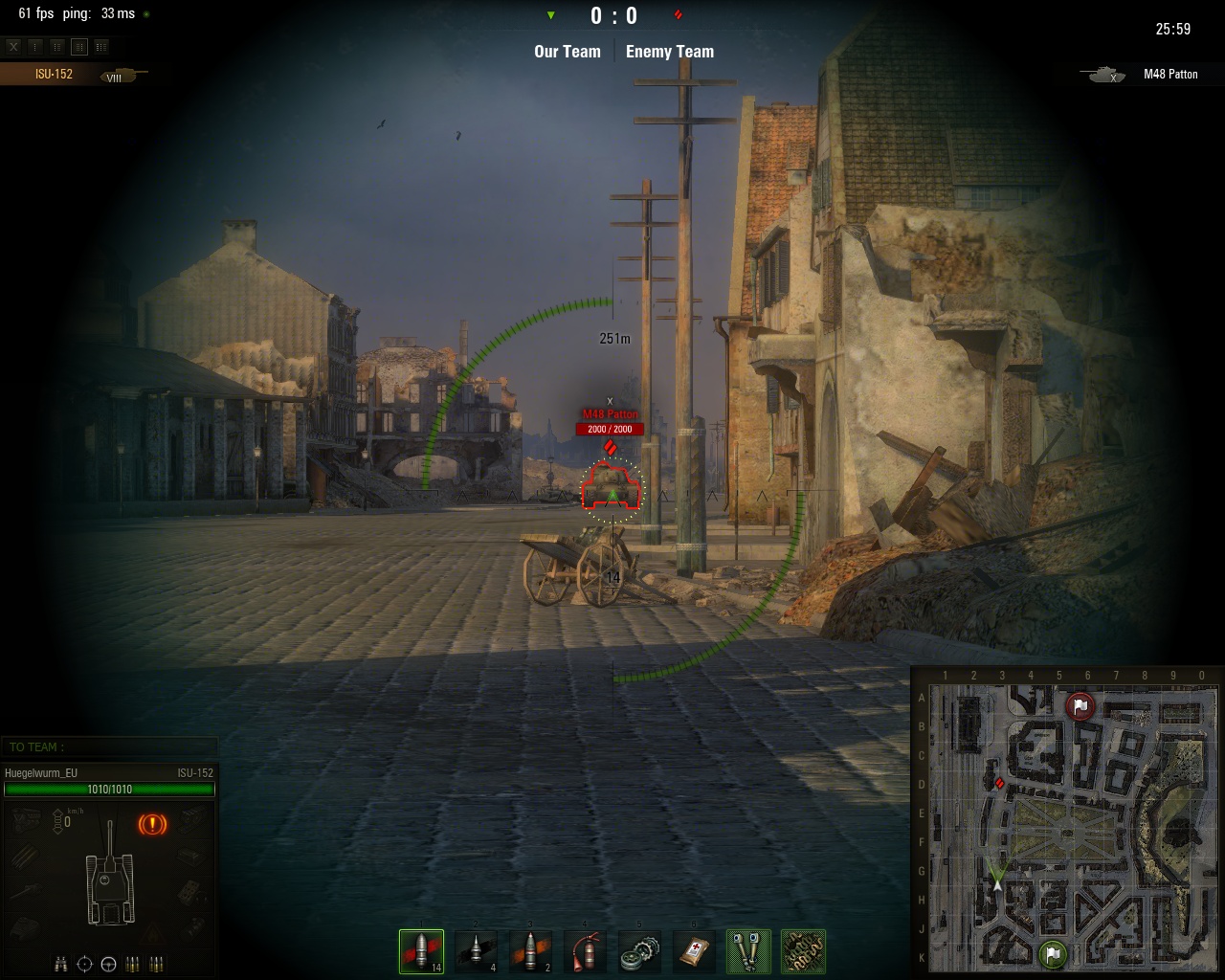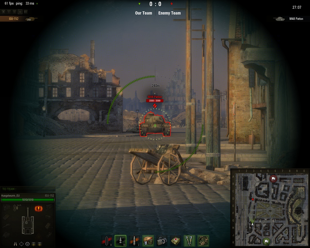 Getestet wurde die ISU-152 und der JP4 mit dem M48A1 Patton (da 420m view range) und dem T1 Cunningham.