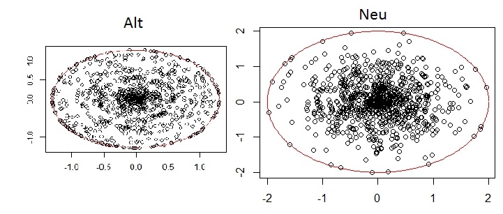 Man sieht ganz deutlich, dass zwar mehr Treffer in die Mitte gehen (wobei man nicht weiß, ob die Anzahl der Punkte hier gleich sind) - es ist aber eindeutig, dass die Ausreißer weiter draußen sind - der Zielkreis ist ja größer.