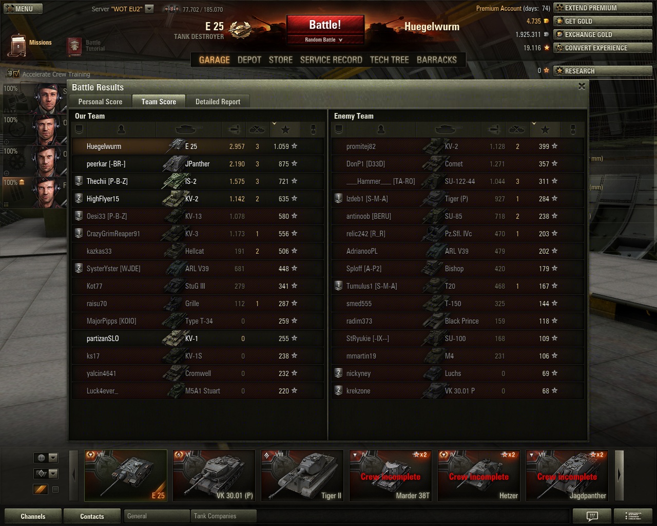 Der KV220 aus der Sammleredition gefällt mir nicht so,seit der Goldschwemme und mit nur 99Pen (ohne Gold) steht man schnell mit abgesägten Hosen da.Seh ich am T14,früher ein echt spassiger guter HT,im Goldzeitalter nur noch ein Schatten.(wenn man so wie ich einfach nicht einsehen will,warum ein Premium mit Gold schiessen muss)