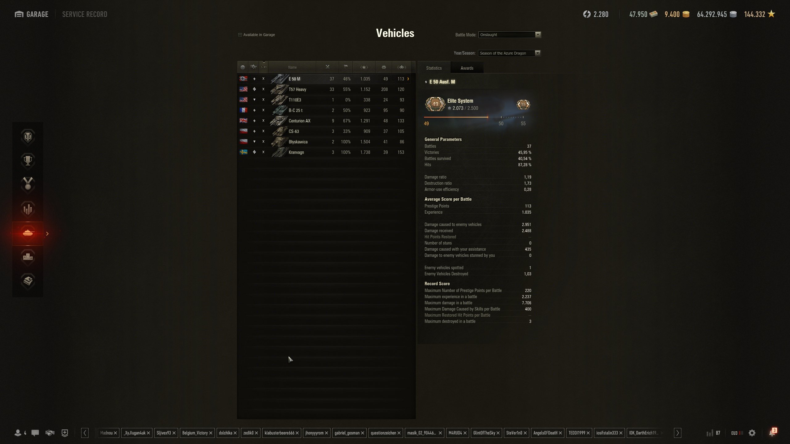 Bei mir lief es bis auf eine gute Runde mit dem E54 Zwilling am Mittwoch gar nichts. Sechs Ansturmrunden gefahren, wieder nur zwei gewonnen. Zum Glück bei den verlorenen gut Damage gemacht, so dass der Punkteabzug gering war. Aber in Summe doch wieder +-0. Wieder kein KPz 50t und Concept 1B in Reichweite, auch wenn ich für beide die Anleihen daliegen habe.