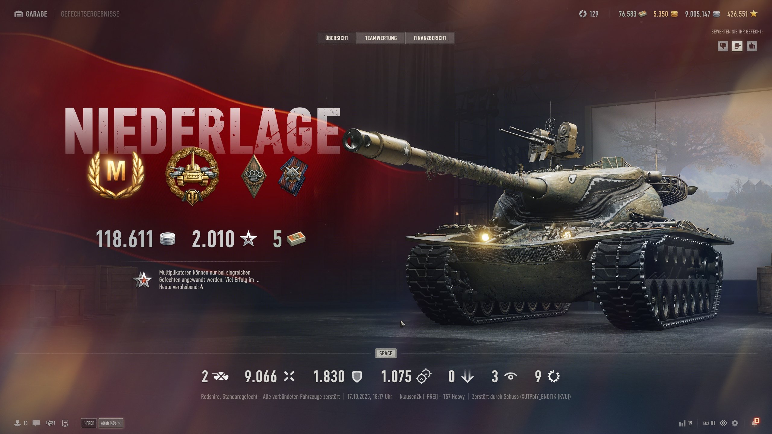 Seit langem kam mal wieder ein M auf dem T57 Heavy, leider eine Niederlage. Mit den 9k bin ich recht knapp an dem Missions Ziel von 10k vorbei geschrammt 😤