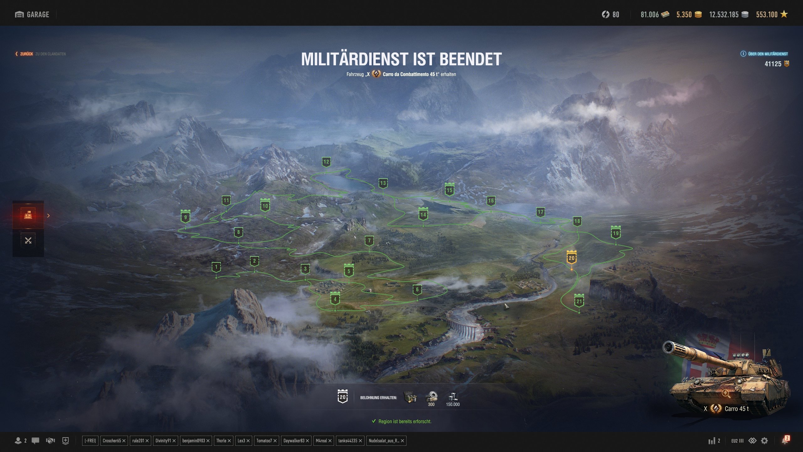 bei diesem Militärdienstaufträgen habe ich den Carro 45t sowie alle Nebenaufträge erfüllt. Dennoch ist es so ein Automatismus bei mir und ich hole immer die 25/50/75 Punkte ab, so daß ich schon wieder auf 850 Dienstpunkte bin.