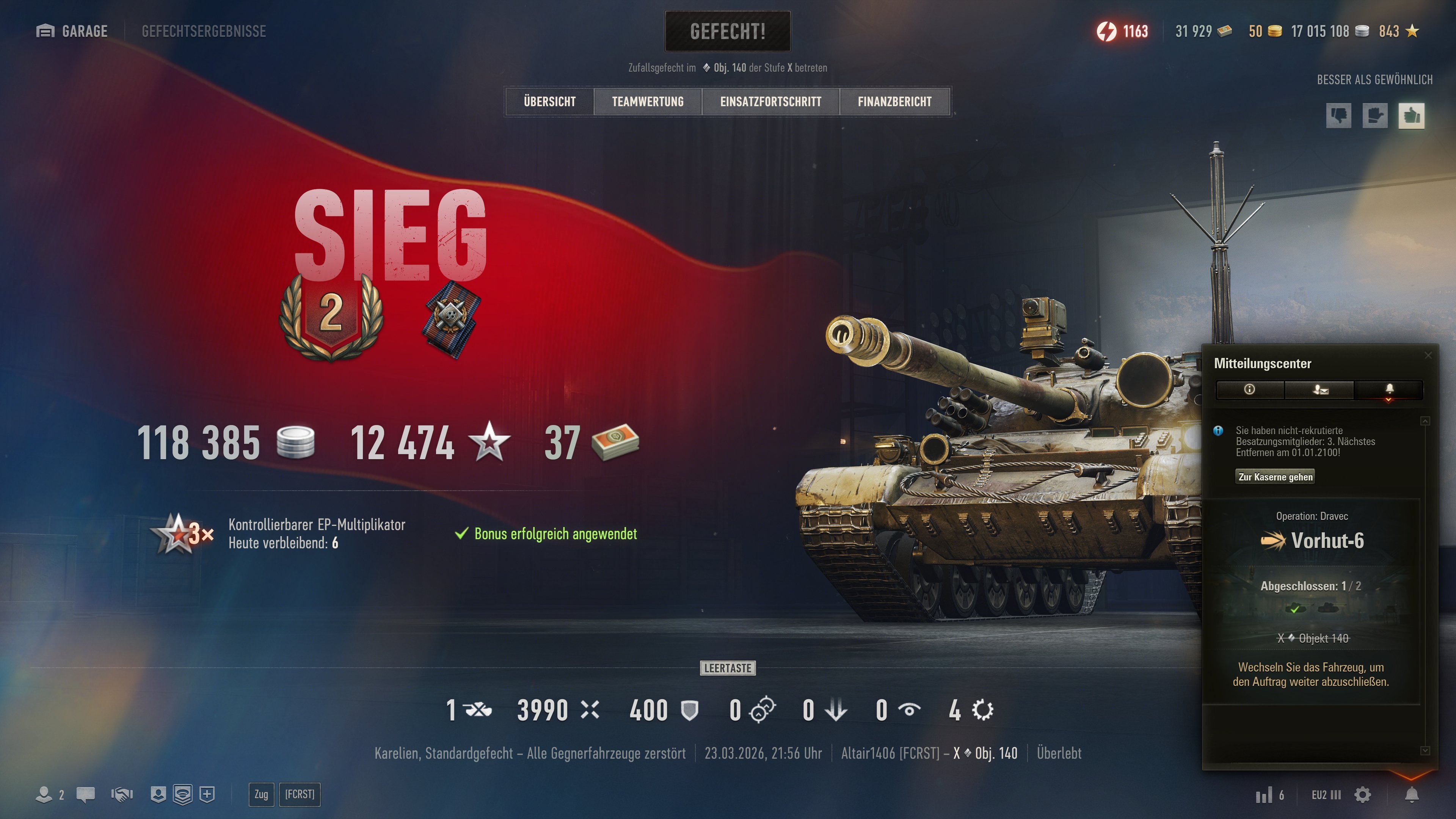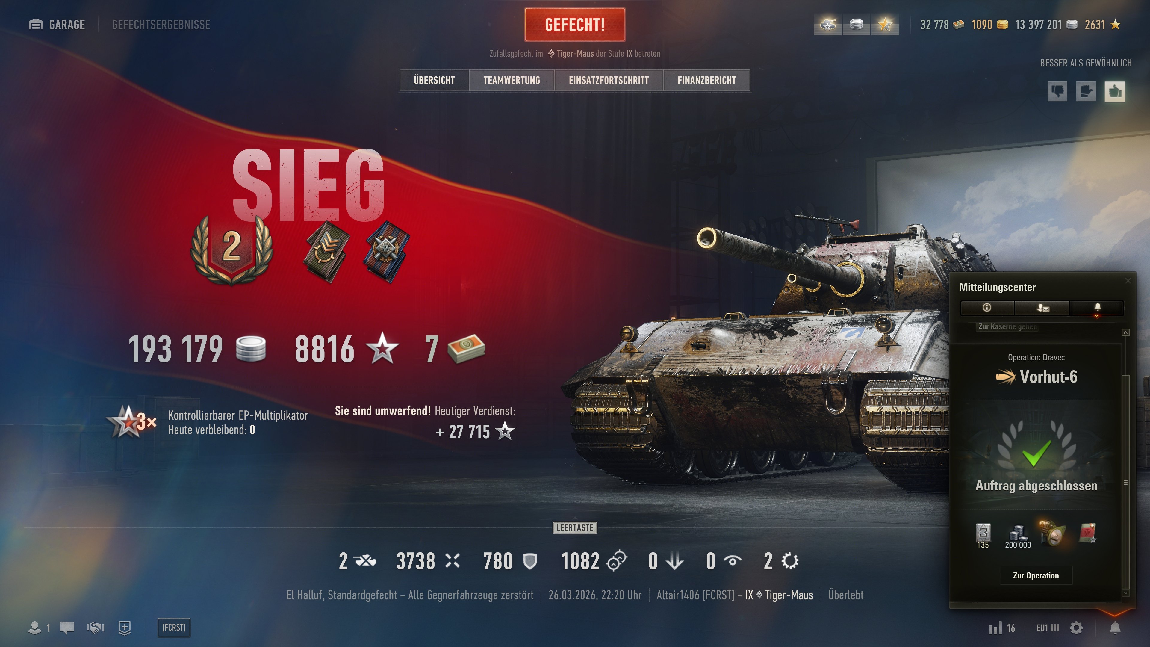 Heute waren ein paar (für meine sonst nur mittelprächtigen Stats) sehr solide Runden dabi. Konnte jetzt auch mit der Tigermaus die Vorhut 6 Mission für den Dravec abschließen, nachdem ich vor ein paar Tagen mit dem Objekt 140 schon den ersten Teil erledigt hatte.