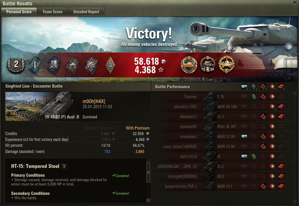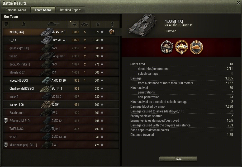 Ach übrigens: vor einigen Gefechten den "Töte einen HT eine Stufe über dir mit 'nem Med" Auftrag gestartet und seitdem immer Toptier oder kaum HTs im Team...
