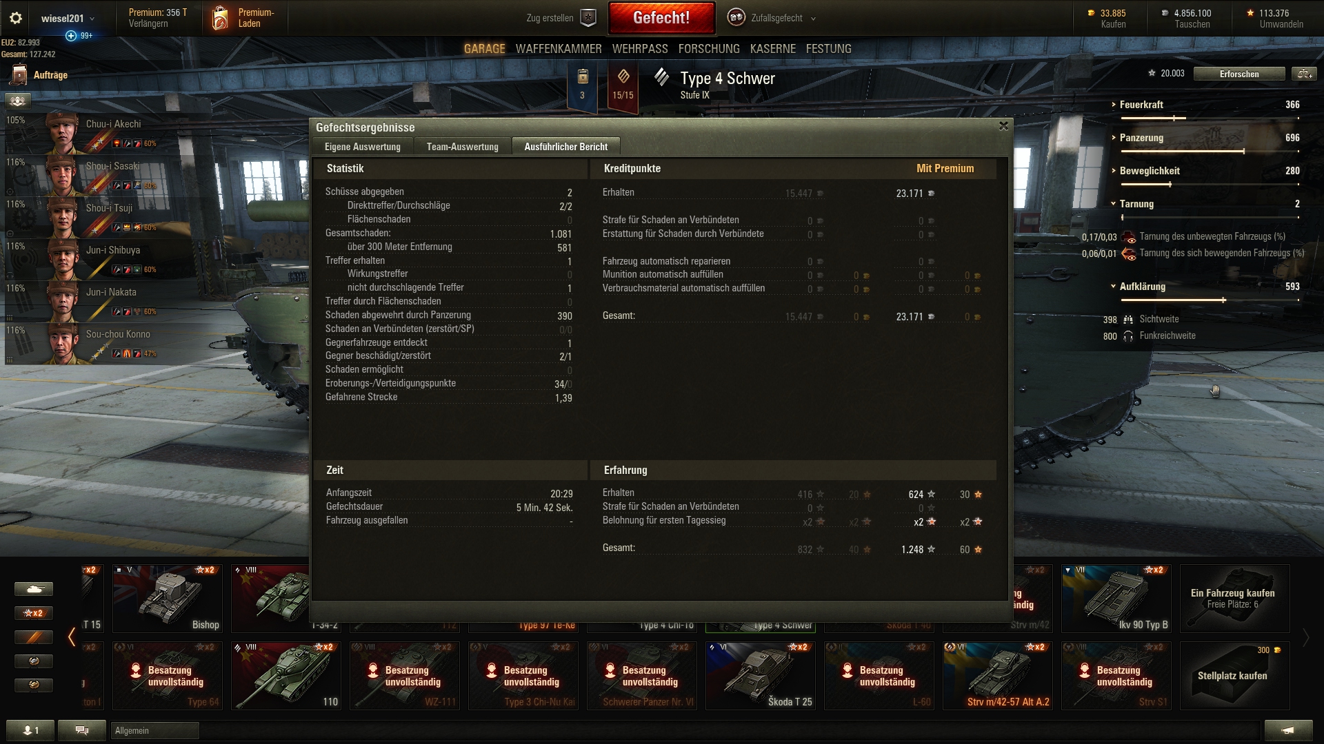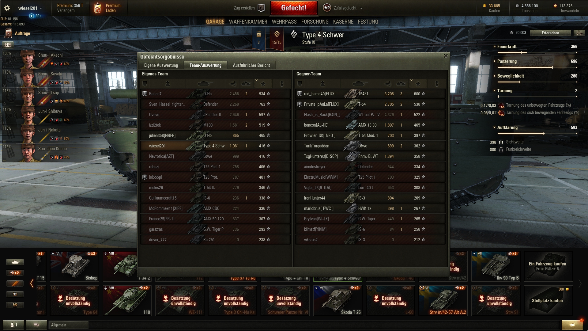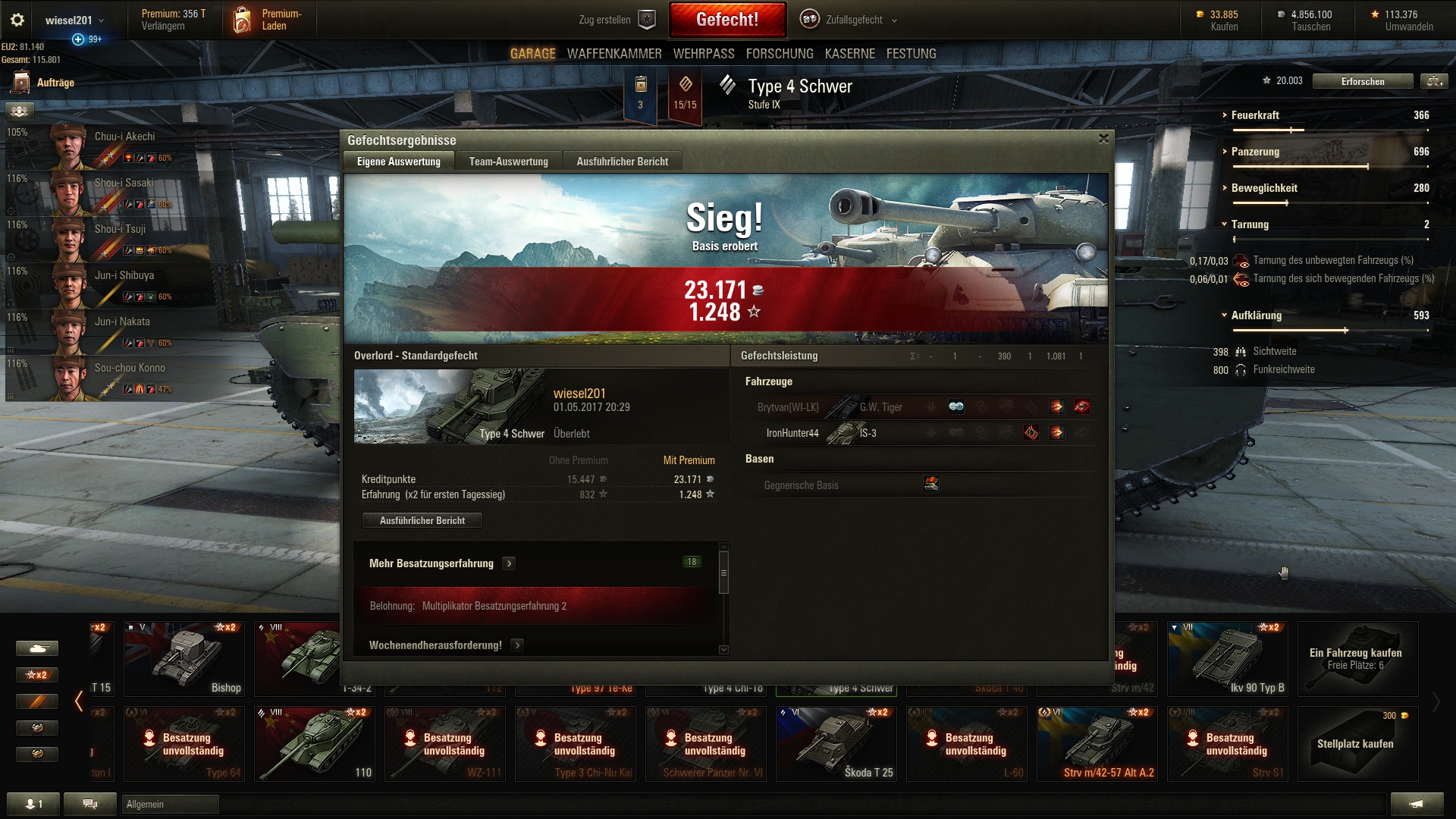 Oh Mann, der Type 4 Schwer ist ja nun wirklich arschlangsam. Bin eben mit dem Teil im Tier 9 Gefecht auf Overlord runter an den Strand und die Steilküste entlang um gemeinsam mit einem O-Ho dort den Gegner abzufangen. Als wir unten ankamen war dort Sand, aber kein Gegner. Umdrehen machte keinen Sinn mehr, also sind wir weiter ans Ende der Karte und hinten hoch in Richtung gegnerische Basis. Als wir oben ankamen war unser Team schon fast aufgerieben, wir hatten also nur noch eine Chance. Am Ende standen wir zwei allein gegen 8 Gegnerische Panzer...