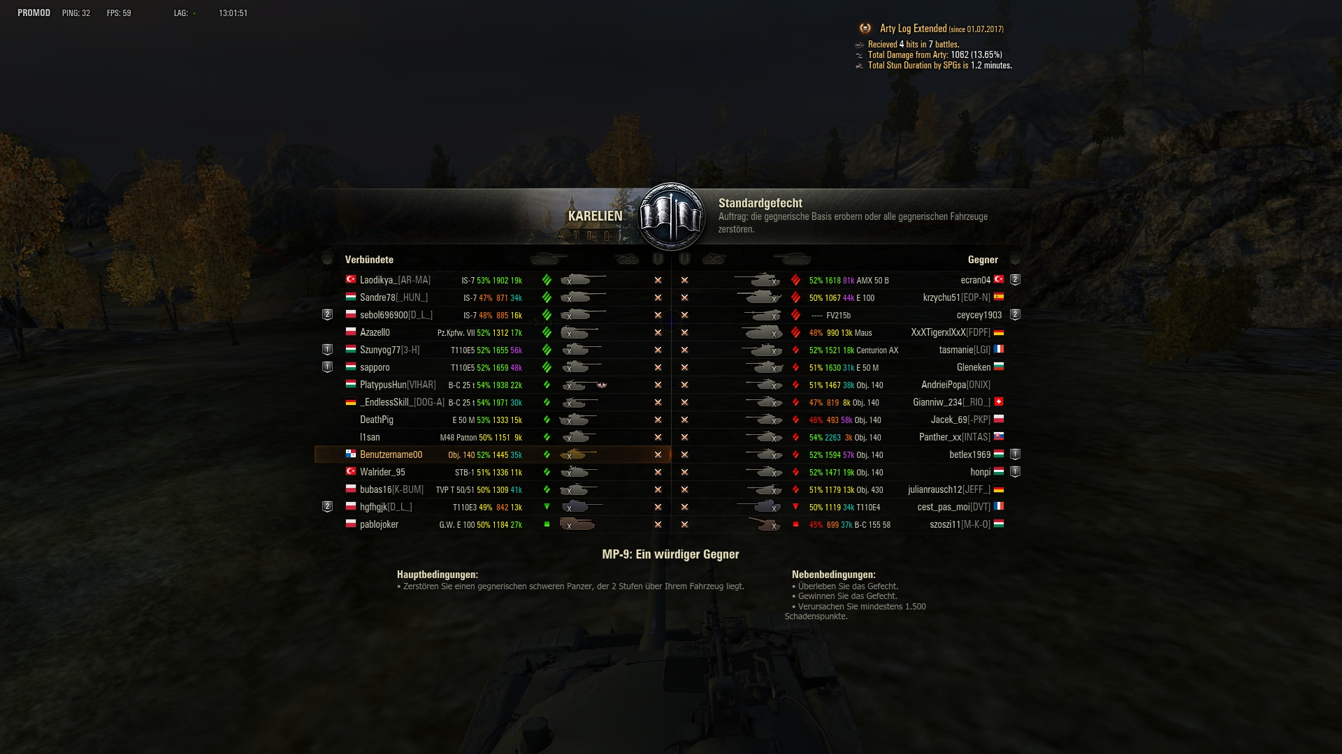Nach dem ganz guten Churchill VII dann der Horror: Der Black Prince. Das war der schlechteste HT, den ich jemals gespielt hab. Da hat man schon so wenig Alphaschaden und wird dann mit ebenfalls wenig DPS belohnt. Kein anderer T7 HT macht auch nur ansatzweise so wenig Schaden pro Schuss wie der BP und trotzdem gehört er zu den schlechtesten nach DPS. Lediglich gute Gun Handling Stats hat man dafür bekommen. Es war aber schon ziemlich deprimierend: Erst fährt man das Ding mit der Churchill VII Gun und als man endlich die Top Gun erforscht hat und sich über das Mehr an Durchschlag freut (wobei er der durchschlagsschwächste T7 HT ist), verliert man dabei dann gleich einen Haufen DPS.