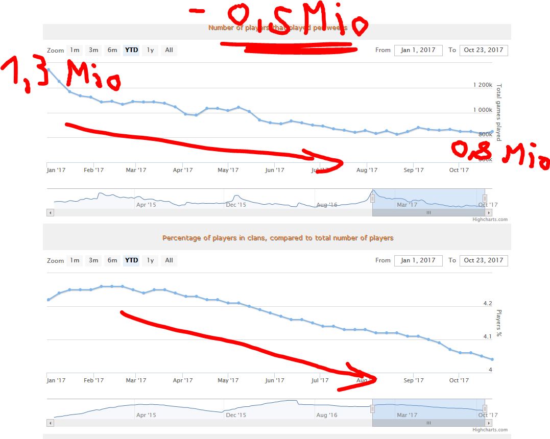 Das die Spielerzahlen sinken, dürfte niemanden verwundern. Ich denke mal es liegt an dem neuen MM. an den ganzen Aktionen die WG veranstaltet. Tagelang geht die Freundschaftsliste nicht, dann die Missionen, die ganzen "OP-Premium-Panzer" Panzer mit SMM kann man nur mehr bedingt spielen, also mit erhöhten Goldeinsatz. Man kann nicht mal mehr vernünftig Premiumpanzer fahren, ohne das man Premiummunition einsetzen muss. Die Panzer werden auch immer mehr auf Premiummun. getrimmt. So wurde beim KV4 der Weakspot frontal entfernt, die Fahrerblende. Tier 10 kann sich ohnehin nicht leisten, wenn man kein Premiumacc. hat. Ohne Premiumacc. musst Du sowieso viel mehr Zeit investieren, als mit. Wer sich ohne Premiumpanzer und Acc. Tier 10 leisten soll, ist auch fraglich. Natürlich kann man sich Creditspakete kaufen, aber das ist ja auch das Ziel... Wie will WG neue Spieler, auf Tier 10 bringen, was sie ja so sehr wollen? Angeblich ist Tier 10 auf dem RU-Server viel beliebter. Neue Spieler, die keinen Premiumpanzer haben, die keinen Premiumacc. ... Wenn die nicht schon bei Tier 6 aufhören. Der Grind zu einem Tier 10 Panzer ist ja elendig. Und dann noch die ganzen Stockpanzer. Das ist schon ziemlich frustrierend.