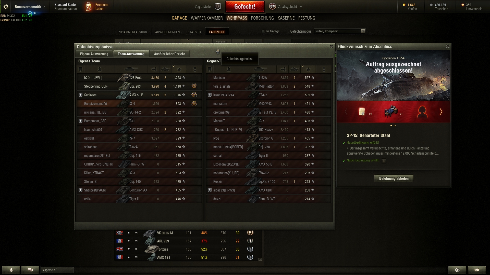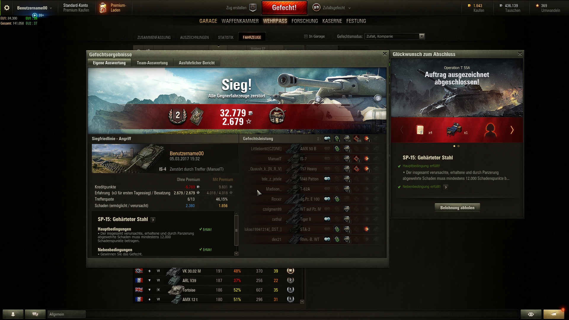 Nachdem ich mein Problem mit den ständigen Treiberabstürzen bei WoT nun gelöst hab, konnte ich wieder spielen, ohne auszurasten. Endlich mal wieder einen 15-er Auftrag abgeschlossen.