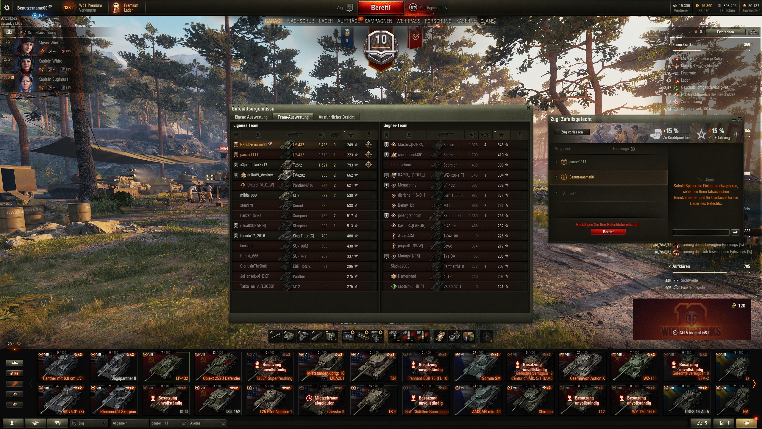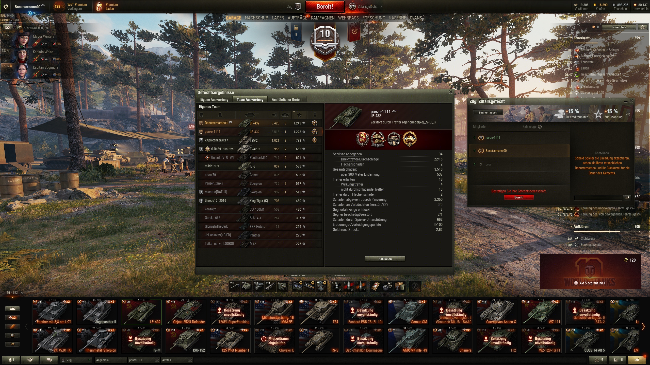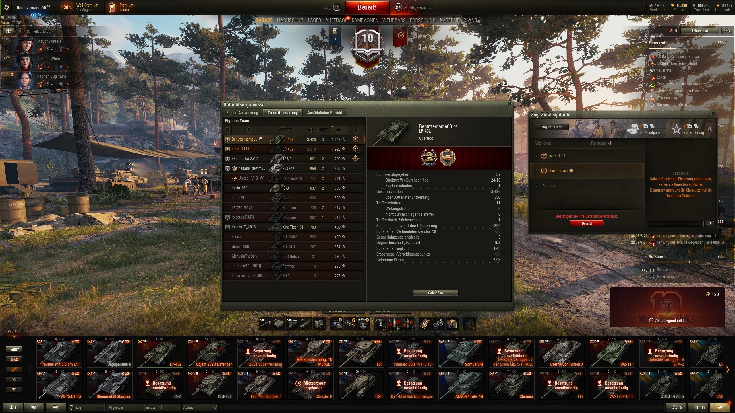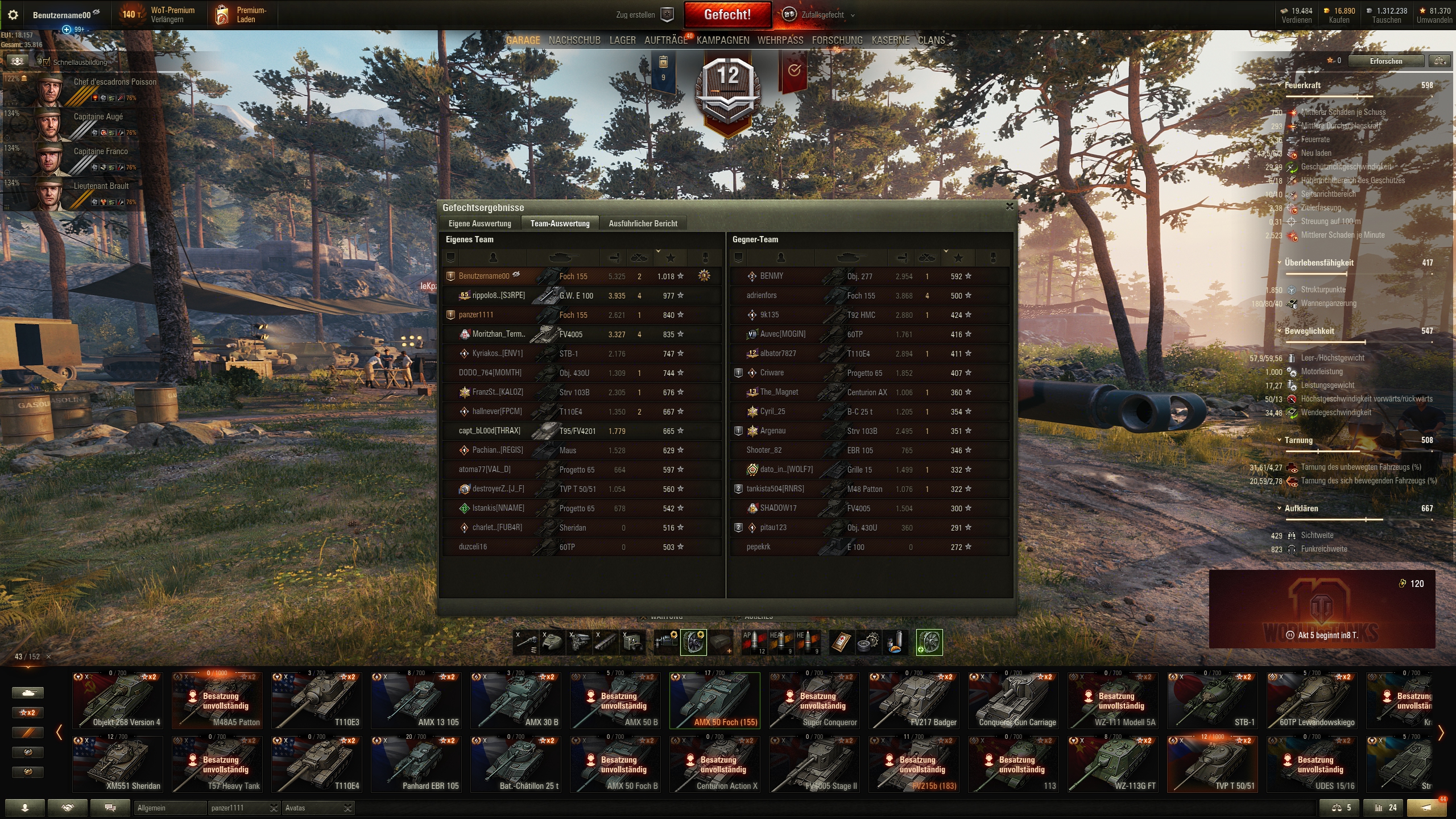 Und zum Schluss noch mal 'ne witzige Foch-Runde gehabt. Campinovka mit je nur einem, LT und wir ham' 'nen schlechten Sheridan? Kein Ding, Mister Foch übernimmt die Spots. Auch mit einem freien Zubehörslot.