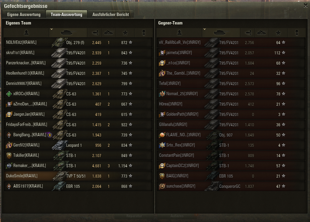 Mir ist schon klar, dass nicht jeder Spieler ein Unicum sein kann. Auch ist die Motivation warum man spielt sehr unterschiedlich, manche wollen einfach nur Panzer spazieren fahren. Soweit ja ok. Und dennoch, was man da teilweise für Spektakel geboten bekommt...Beitrag schrieb:Naja, ganz rausnehmen kann ich mich da aber auch nicht. Habe heute bspw. gesehen, wie ein Jagd. Pz. E100 mit purer Absicht in die Gegner reingefahren ist, um sich killen zu lassen, obwohl er gerade eigentlich eine wichtige Position hätte verteidigen können, habe dann auch "idiot" in den Chat geschrieben.