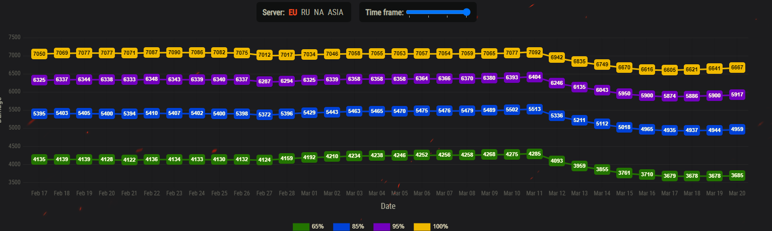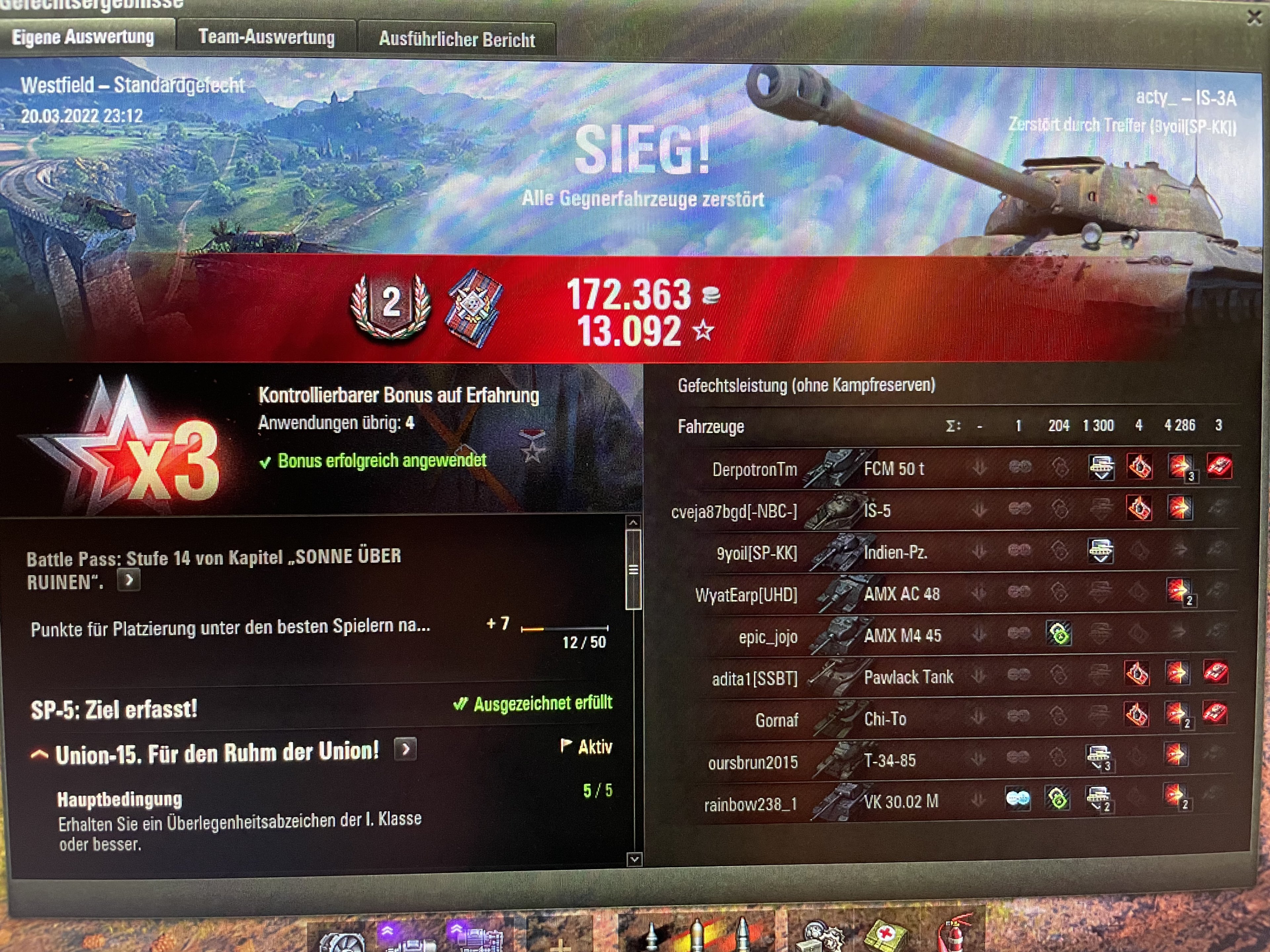 Das sieht man auch mal wieder schön, dass wenn man 100 % auf nem Panzer haben sollte, man nicht unbedingt der alleinige beste aufm Server ist. Sonst würde es keinen Sinn machen, dass die 100 %-Marke abfällt, nur weil jetzt vermehrt (unter-)durchschnittliche Spieler den Chief haben.