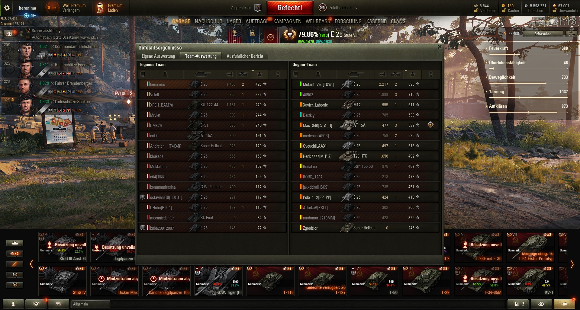 Ich bin im Süden von Ensk im T55a gestartet, Stufen 8 bis 10. Die Gegner hatten drei Unicum in guten Panzern als 10er (kein Platoon, S.Conq, progetto65) und sonst noch einige gute Spieler, mein Team und insbesondere meine 10er waren eher mäßig begabt und waren z.B. im E100 unterwegs. Ich schätze mal XVM hätte <10% Winchance auf mein Team gesetzt. Aber Ensk gehört ja nun zu den eher schlechter balancierten maps und wir hatten den guten Spawn. Aus den 10% Siegchance haben wir dank der Map ein 15:1 Sieg in 6 min gemacht, die Karte ist echt unglaublich. Die offene westliche Seite ist vom Norden aus fast nicht zu gewinnen.