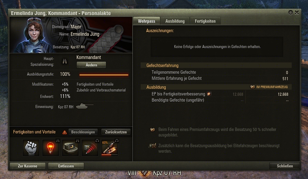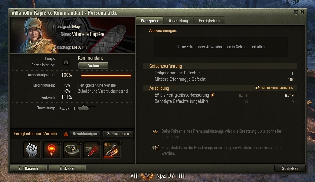 Davon abgesehen musste ich Villanelle aber eh nochmal umskillen, da beim Skorpion der Kommandant die Funktion des Ladeschützen mit übernimmt und nicht wie bei vielen anderen, die Funktion des Funkers. Da bringen dann zweimal Weitsicht und zweimal Signalverstärker leider überhaupt nichts.