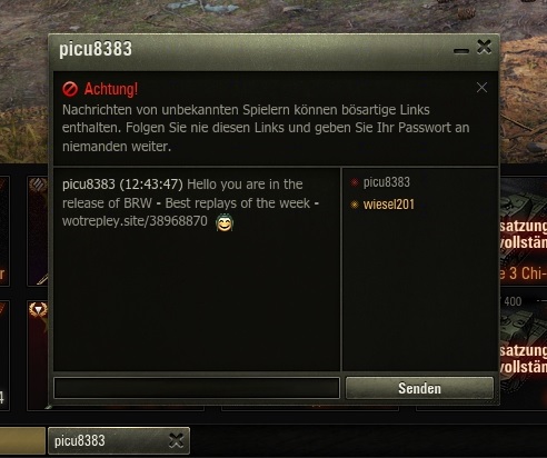 wiesel201 schrieb:Heute bekam ich eine Nachricht, ich würde in irgendeinem Replay of the Week auftauchen, mit Link. War natürlich eine Scam Seite. Dummerweise hab ich meine Anmeldedaten eingegeben: Als nichts passierte schwante mir böses. Kurze Recherche, und ein paar Minuten später habe ich direkt mein Passwort geändert. Den Typen habe ich an Wargaming gemeldet.