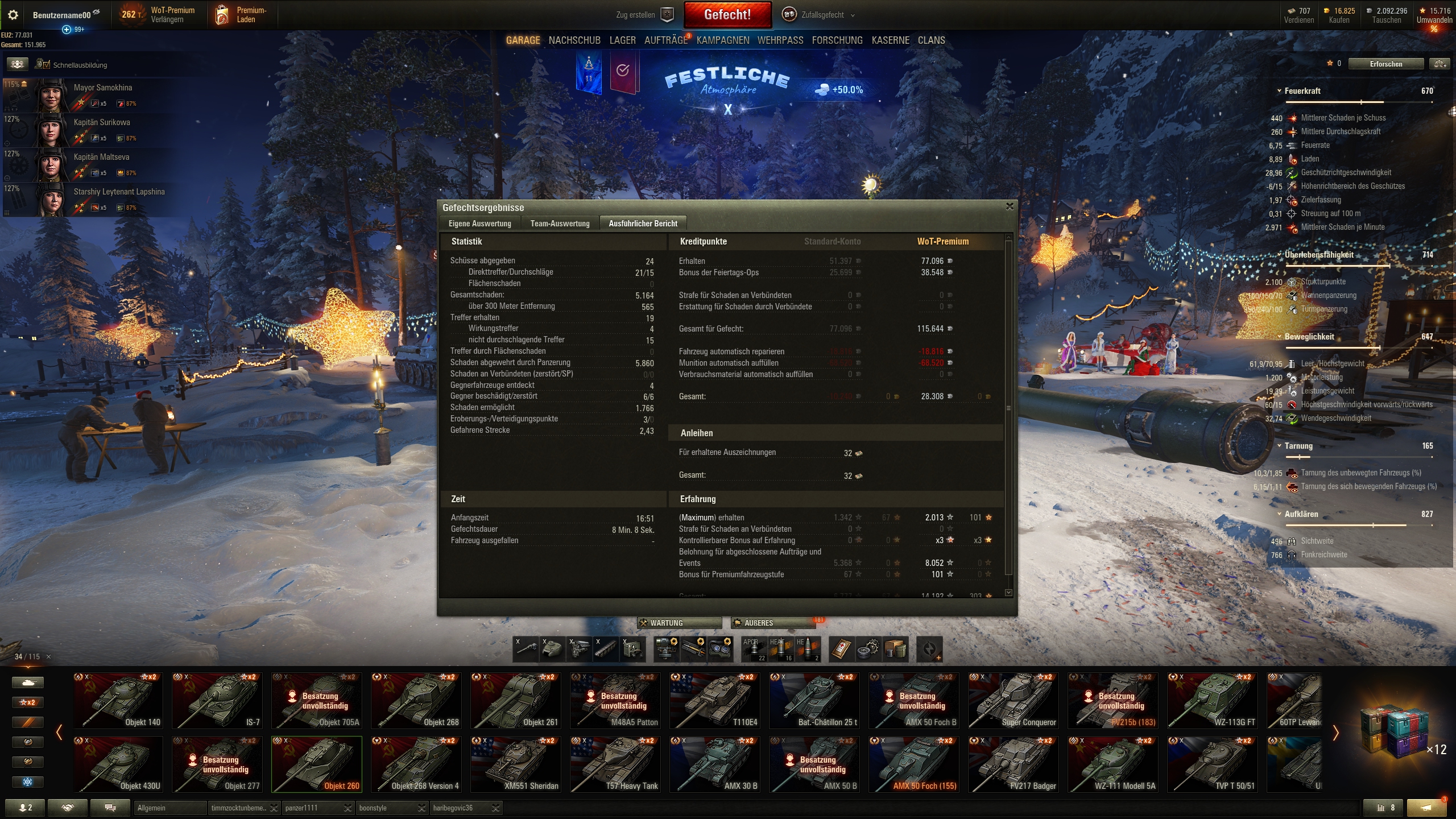 Ich fahre auch nicht die Ganze Zeit 8er Premiums sonst wäre es noch etwas mehrBeitrag schrieb:Tja, wenn man denn Lust hat immer stumpf 8er Premiums zu fahren. Die letzten Tage habe ich hauptsächlich Tier 10 gespielt, weil mir das atm am meisten Spaß macht, ich die Neukäufe ausführen musste und weil ich Missionen versuche. Bin gerade ziemlich nah am 260 dran.