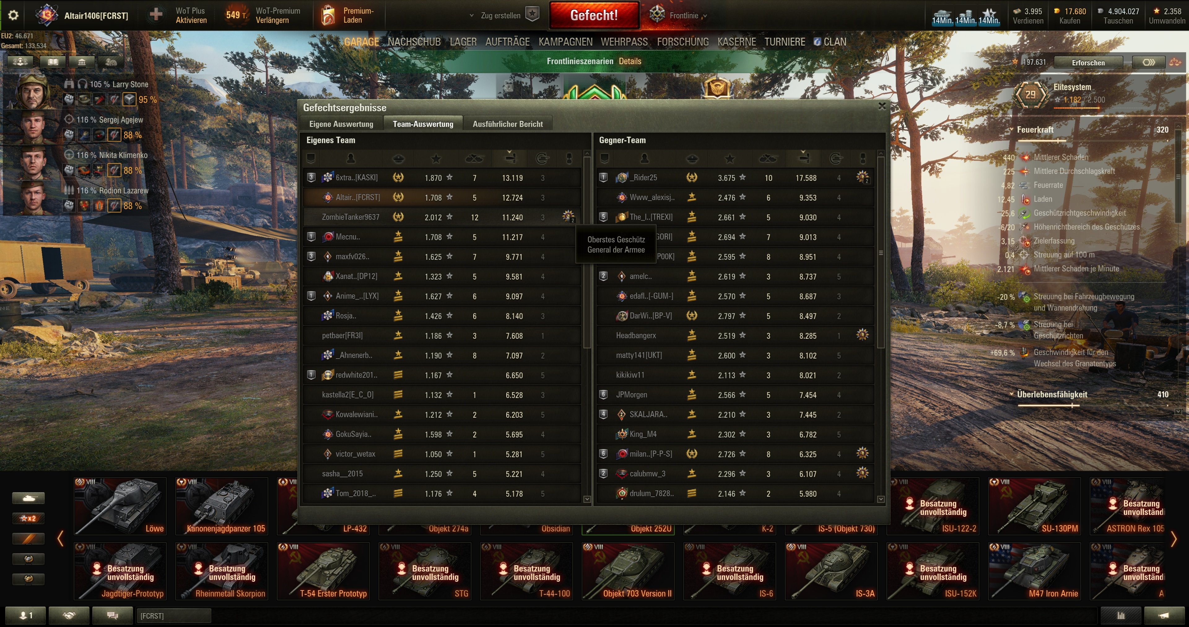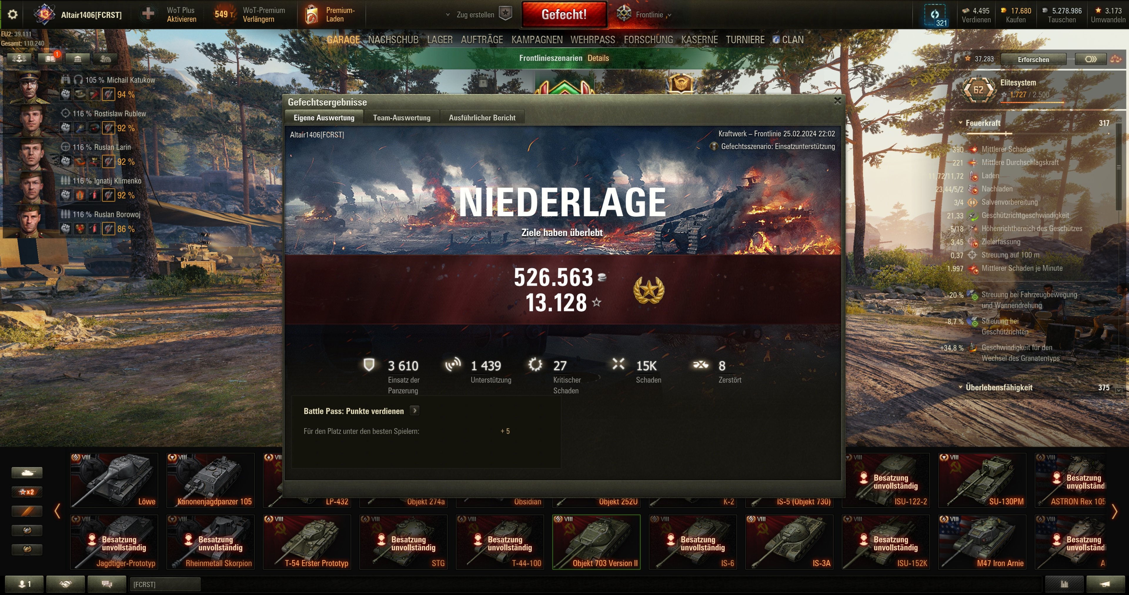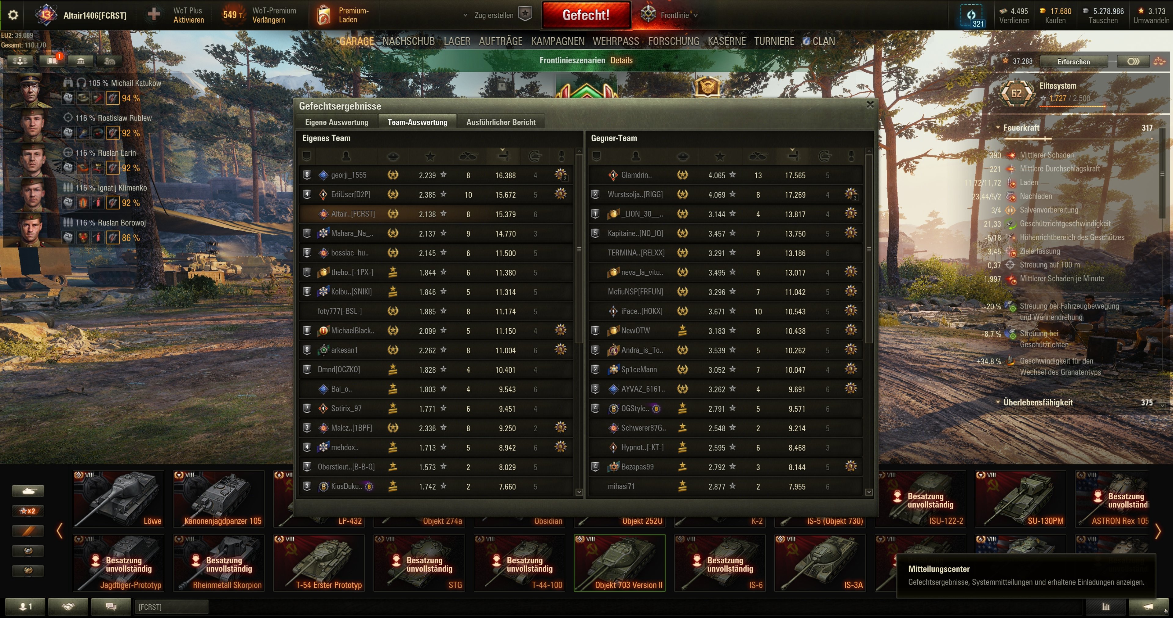 Beim ersten Match, nur weil das Object 703 II mit seinem fetten Ar*** nicht schnell genug den Hügel hochkam, dann hätte ich oben noch mehr Schaden machen können und über 16K gehabt. Aber jetzt habe ich Frontlines durch, bin Lvl 20. Dann beginnt die Jagd auf das oberste Geschütz eben das nächste oder übernächste Mal wieder.