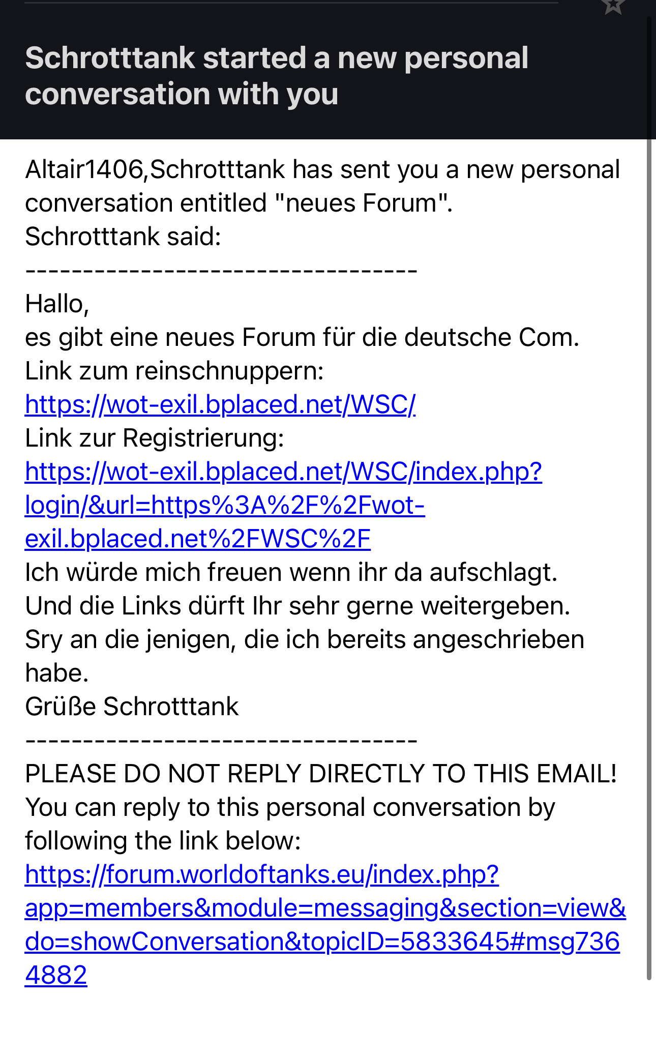 Edit 3: Habt ihr von einem ehemaligen Mitglied aus dem WoT Forum (bei mir hieß er Schrotttank) auch eine persönliche Nachricht erhalten, dass wohl ein neues Forum für WoT eingerichtet worden ist. Schaut mal bitte auf Bild 3 unten, so sieht die persönliche Nachricht aus.