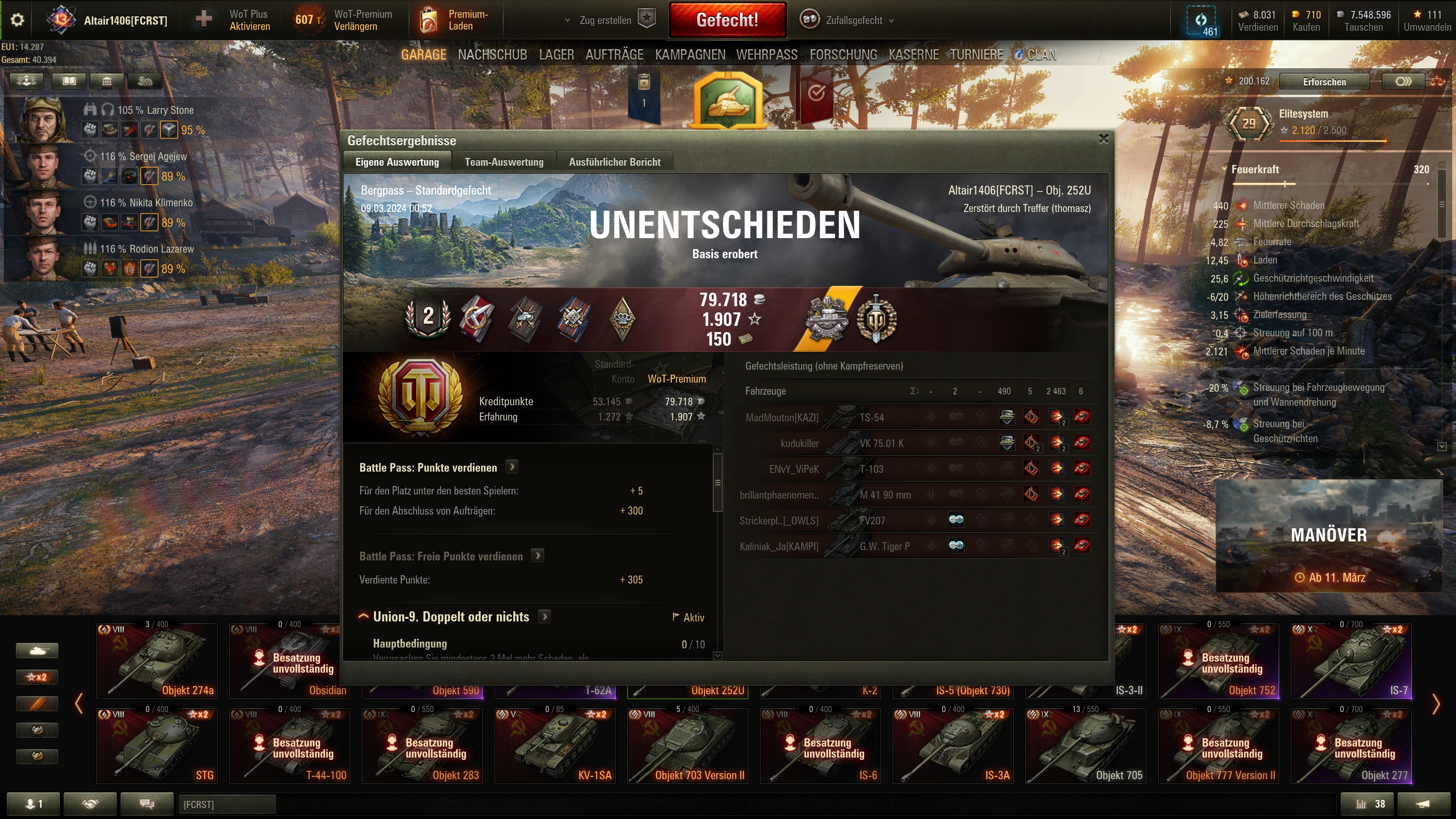 Crewmitglieder habe ich haufenweise auf Halde. Sind um die 25 Stück oder so. Etliche mit 3 Zusatzvorteilen, vielen mit 2 oder einen Vorteile und alle mit Brother in Arms. Weiss aber gar nicht wo ich die hinsetzen sollte weil viele davon nur als Kommandanten und für bestimmte Länder einsetzbar wären. Da müsste ich einen Haufen neue Panzer kaufen, wüsste aber nicht wozu.