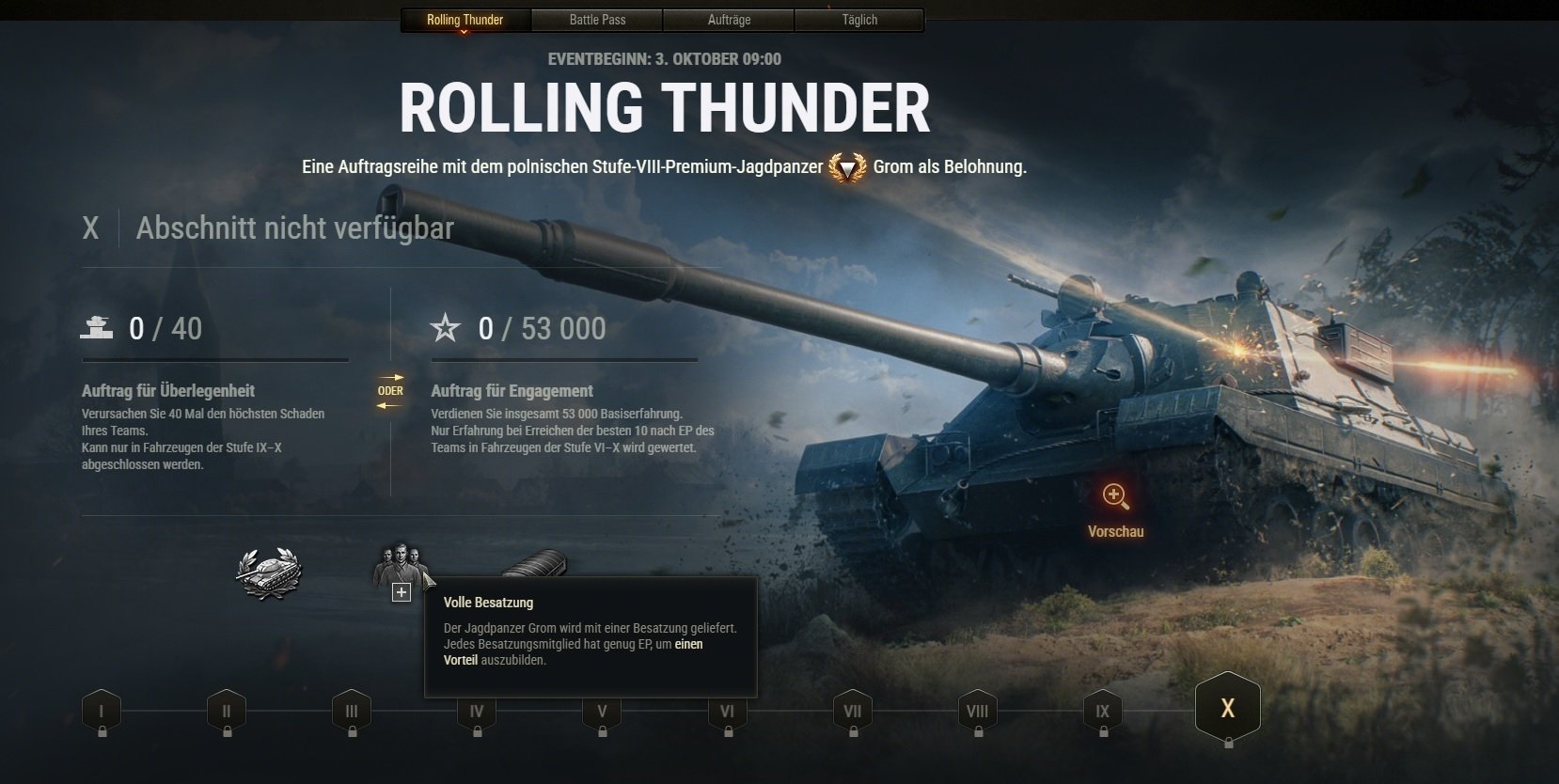 Hier sind die Anforderungen für die verschiedene Stufen: https://www.reddit.com/r/WorldofTanks/comments/1fu5l24/grom_marathon_requirements/ Insgesamt sind es 261000 Base-XP in 11 Tagen - na dann mal viel Spaß.