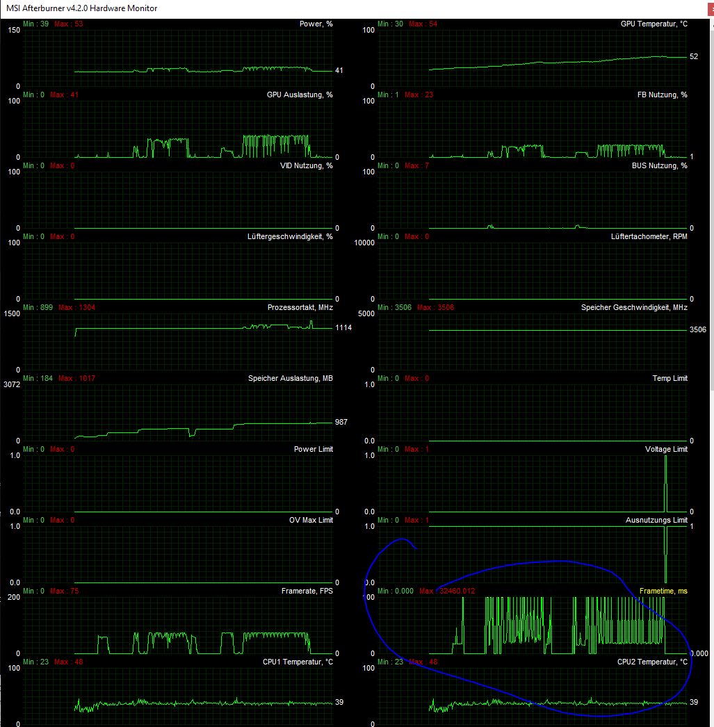 Im MSI Afterburner konnte ich feststellen, dass zwar die FPS stabil aber die Frametimes eine wilde Party feiern.