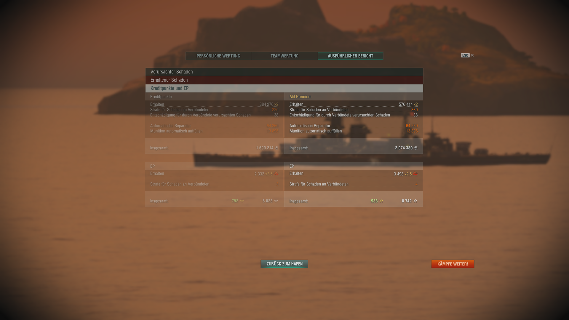 Verdoppeln? Du bist gut ... nach Kauf von Myoko und Pepsi habe ich wieder nur noch knapp 100.000 Credits ... das könnte ich mit einem guten Tirpitz-Sieg schon verzehnfachen!