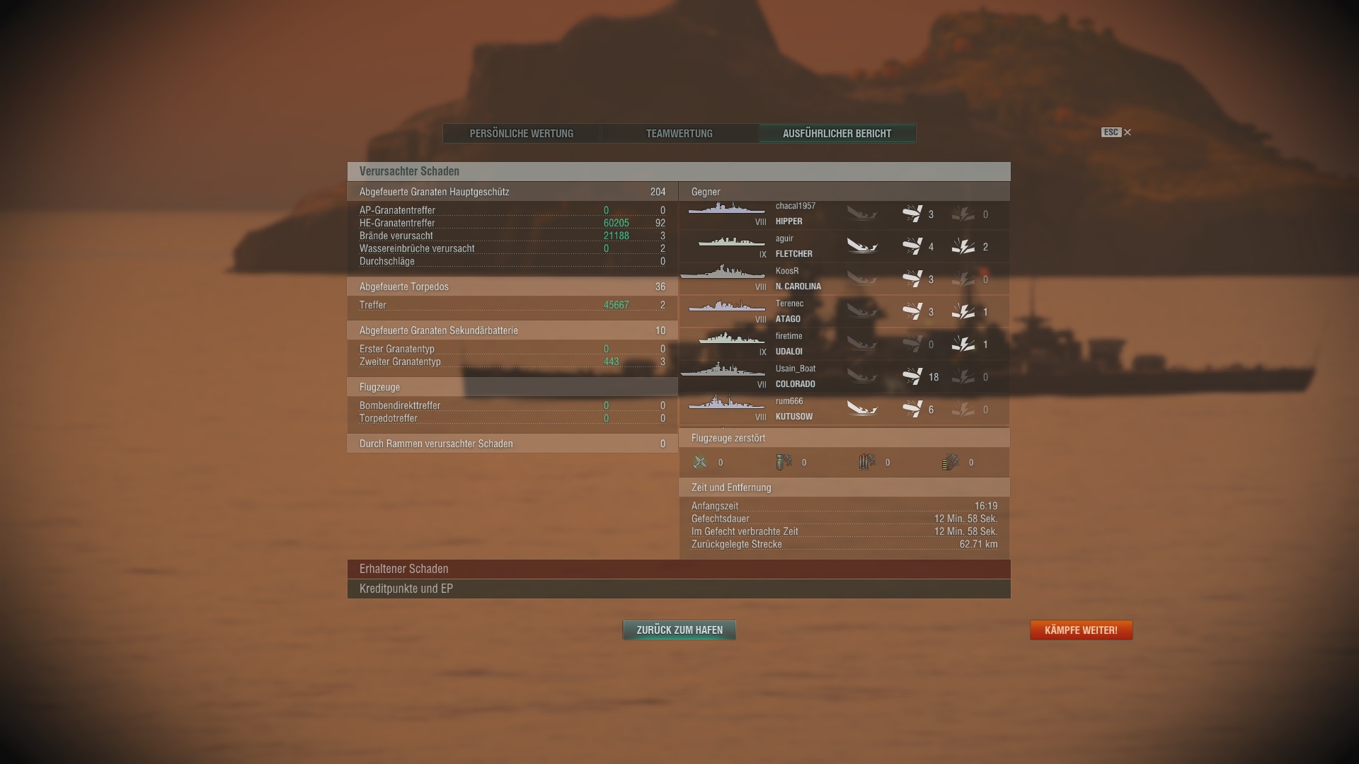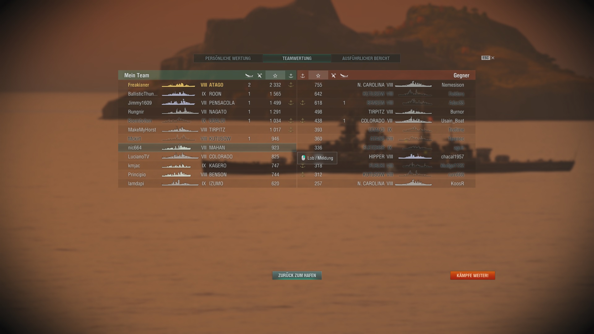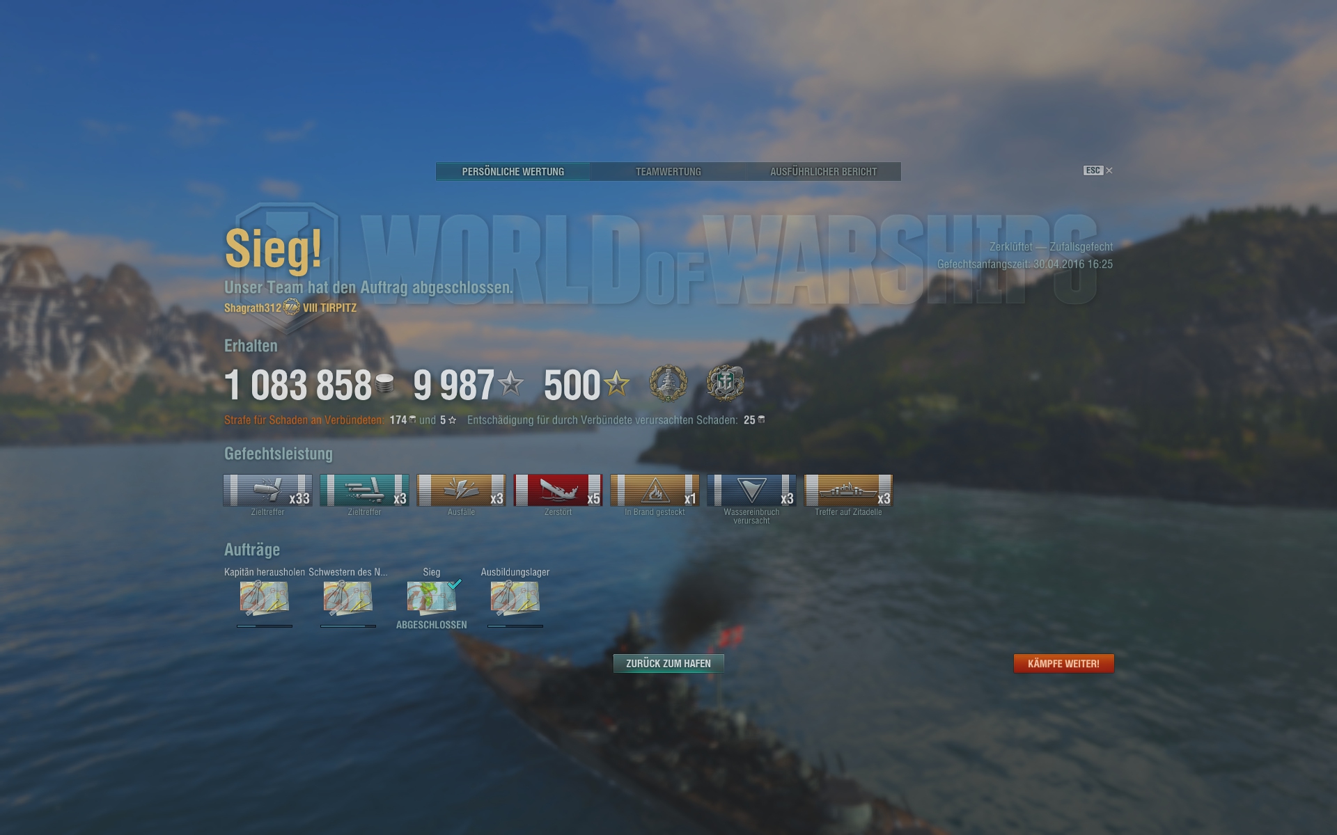 Gerade das erste Match heute ... Tirpitz, aber Niederlage ... zwar 120K Schaden und 400K Credits, aber wir wurden alle versenkt und haben selber nur 2 Schiffe gekillt? Peinlich ...
