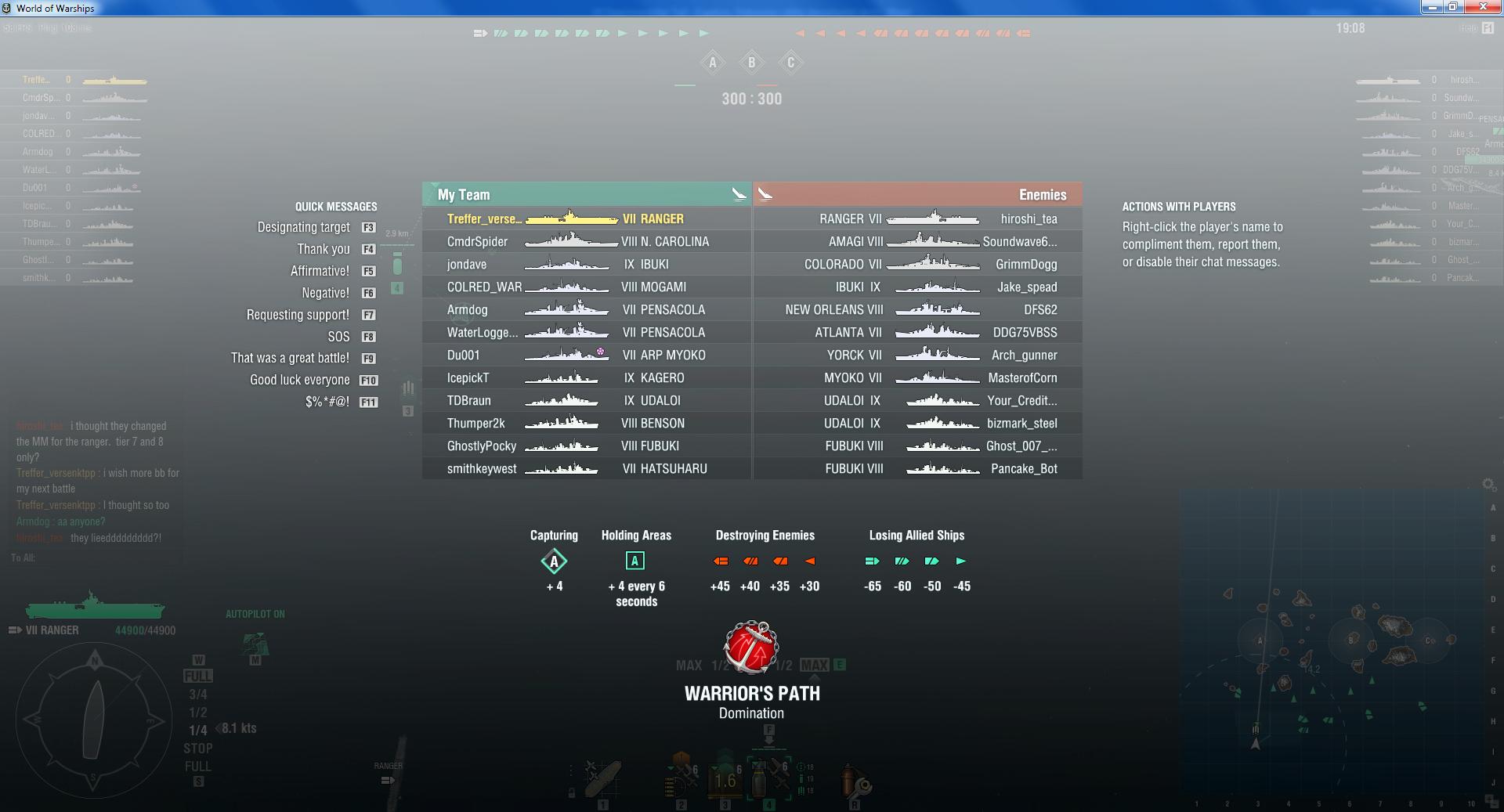 Die Punkte tickten für uns runter, als in einem verzweifelten Finale ne ziemlich intakte Yamato und dahinter noch ne NC mit Volldampf um die Ecke bog, also quer zu mir, mit allen Geschützen auf mich gerichtet, ich aber natürlich nicht doof die Spitze zur Yamato, kam die um die Insel gebogen direkt vor der Cap-Grenze.