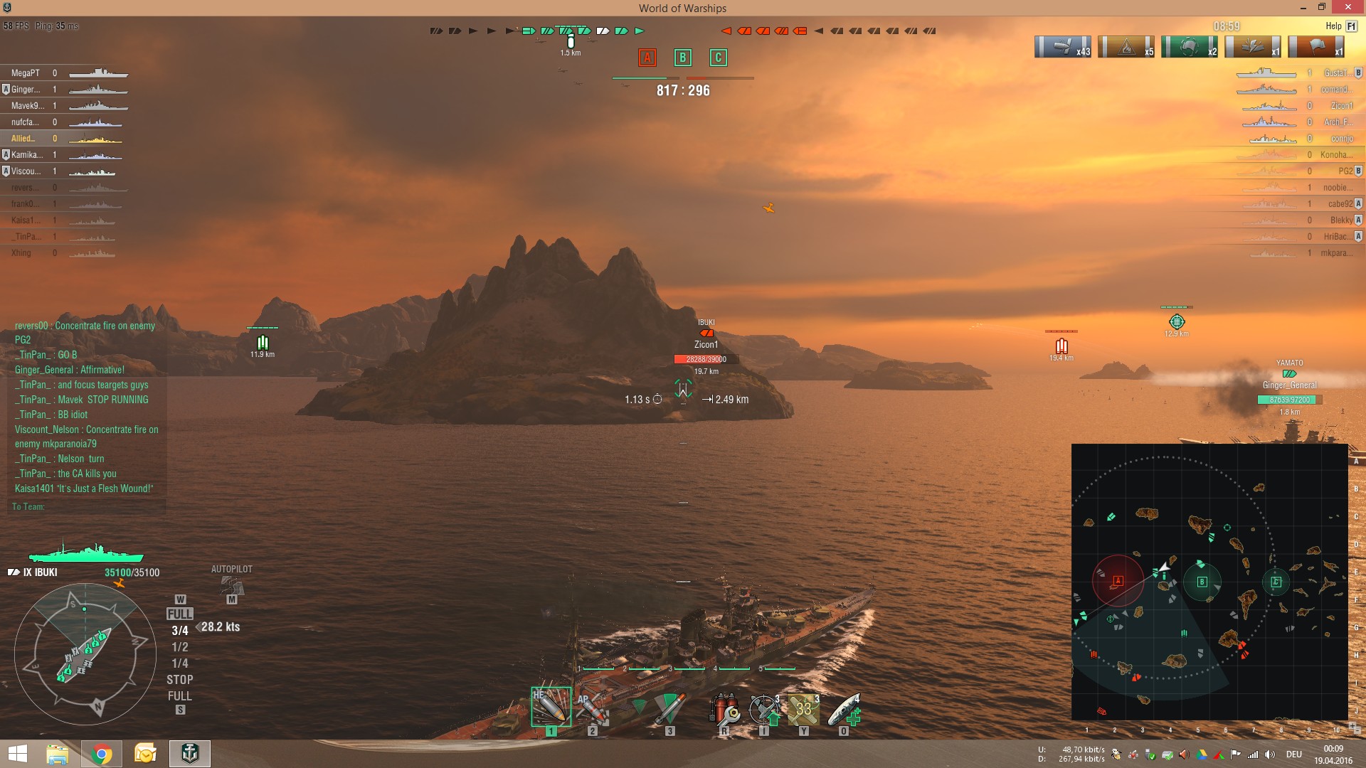 Mit der Ibuki hingegen fühle ich mich "Sauwohl"! Mit dem GFCS Modul komme ich jetzt auf 19,1km Reichweite (wieviel hat die Amagi?) und kann entspannt auf lange Distanzen zündeln. Natürlich nicht primär, mann soll ja auch das Team unterstützen! Und obwohl ich gestern Abend in meinem letzten Gefecht durchaus aktiv war (capping, Montanas anzünden, AA support geben), also nicht hinten rumlungerte, hab ich das Gefecht unbeschadet (!) überstanden. Auf 15km+ kann man einer Montana und einer MK relativ entspannt ausweichen.