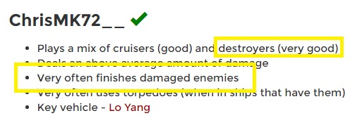 Jetzt weiß ich auch endlich woher dieser Spruch aus dem Statistikteil kam, von wegen "finishes other ships often", oder so !